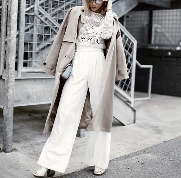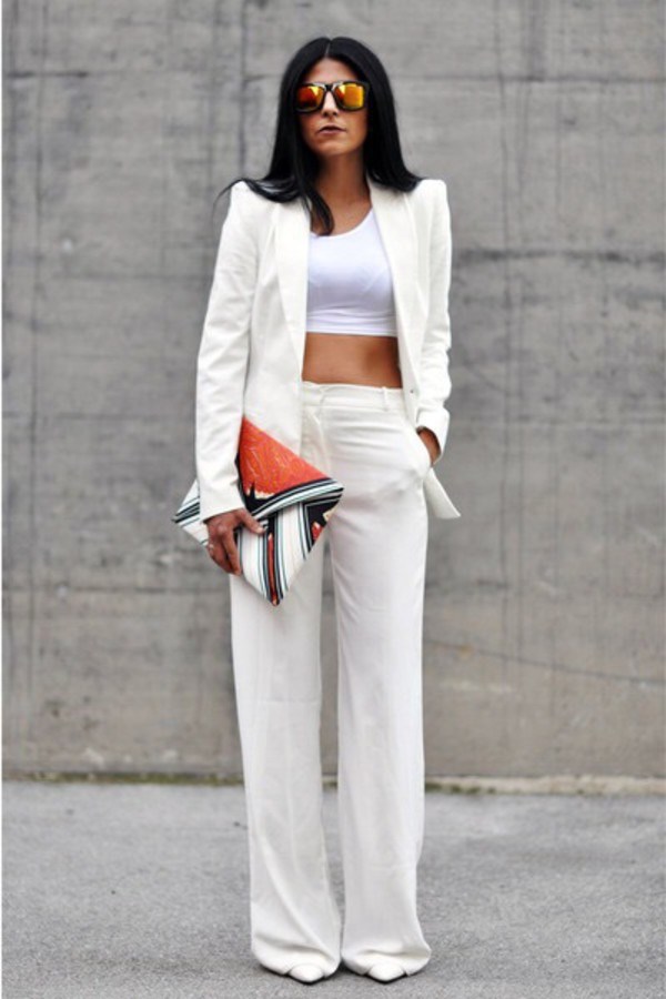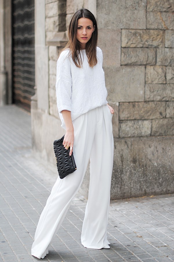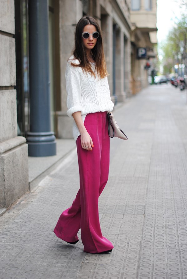 Vous pouvez compléter les images à la mode avec un pantalon évasé en choisissant un beau haut sous la forme d'un chemisier ou d'un haut, d'une veste solide, d'une pochette ou d'un sac à main, et bien sûr de chaussures à talons ou compensés.