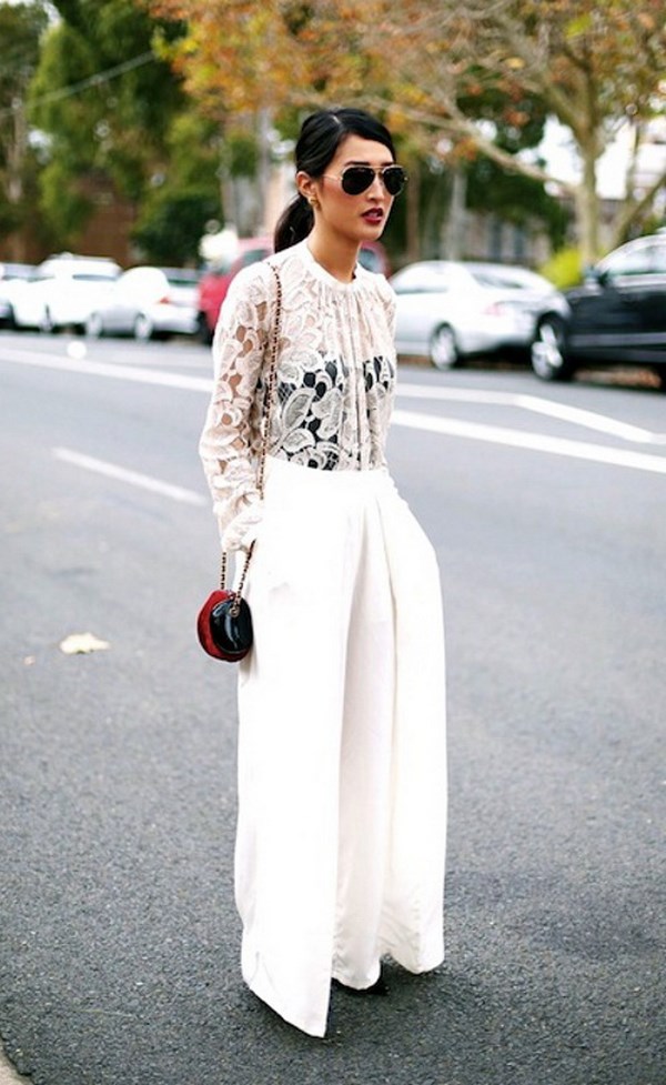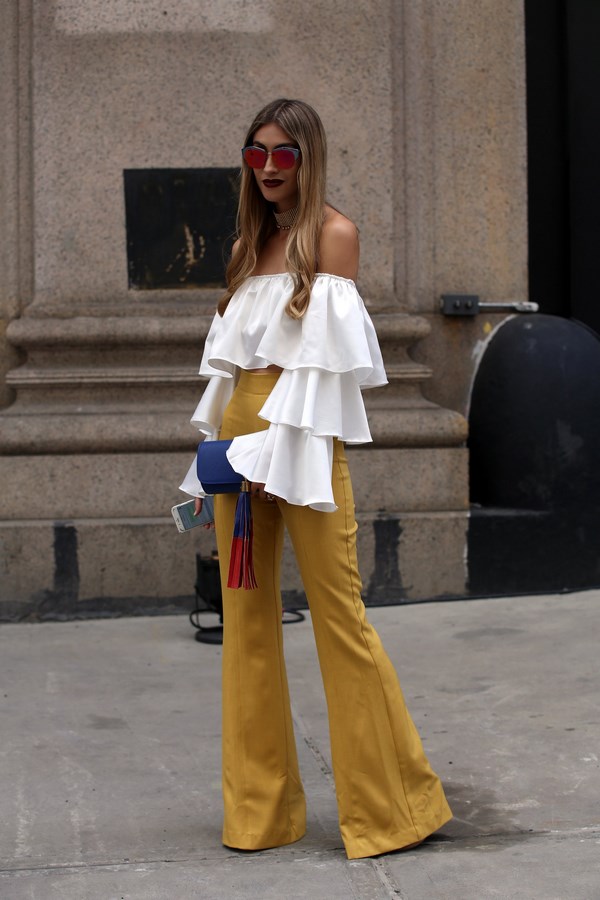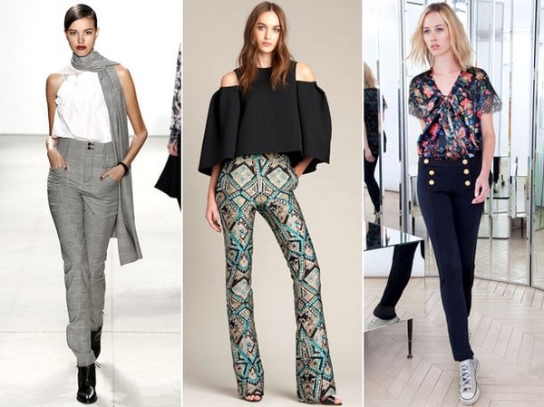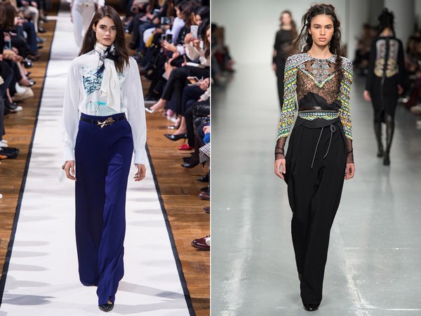 Les stylistes recommandent de compléter les pantalons à la mode à la mode avec des hauts ou des chemisiers romantiques et féminins avec des noeuds et des empiècements en dentelle.