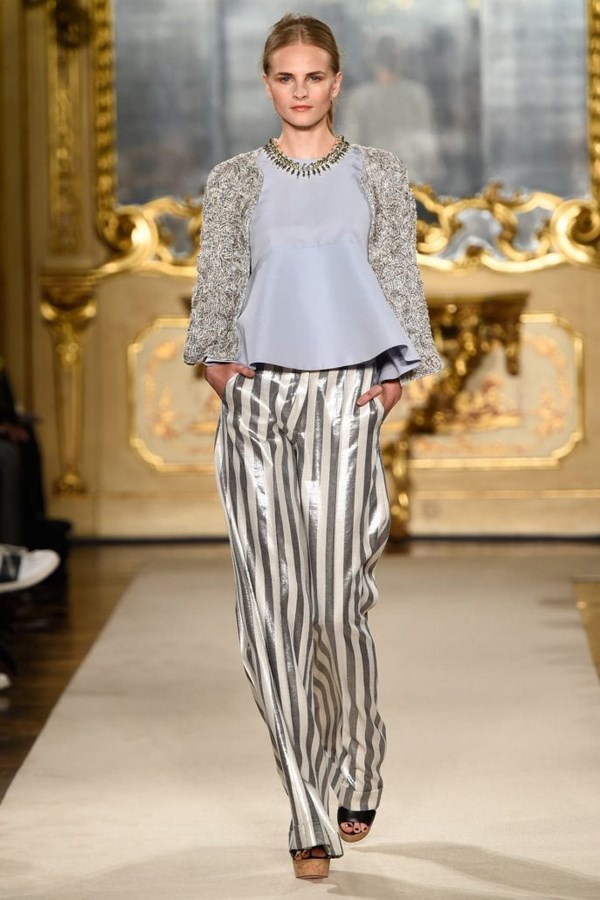 En outre, les pantalons originaux sont illustrés avec des imprimés, un effet de métal, des rayures, ce qui est très, très unique dans les images à la mode de la saison 2025-2026.