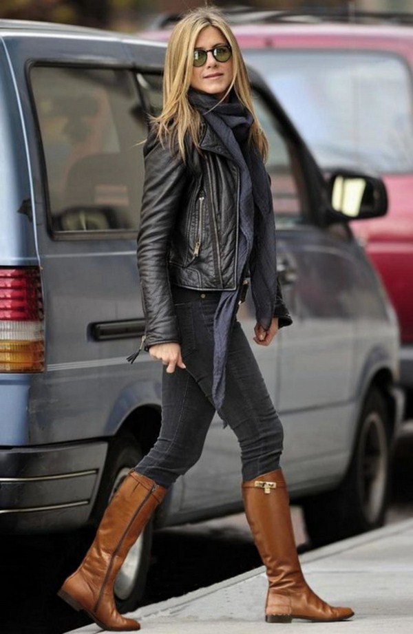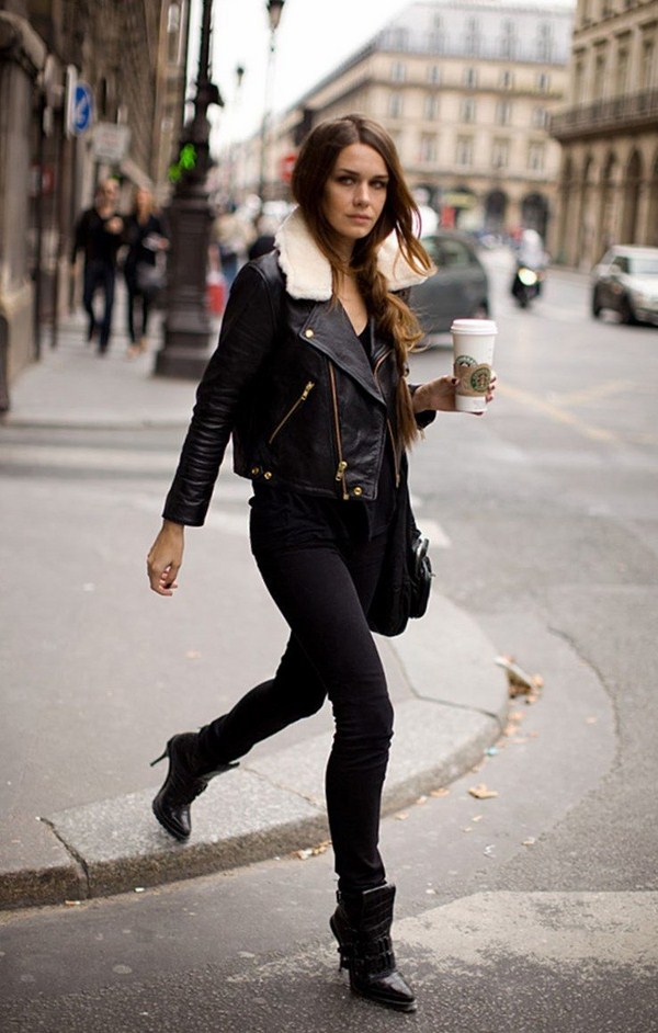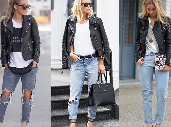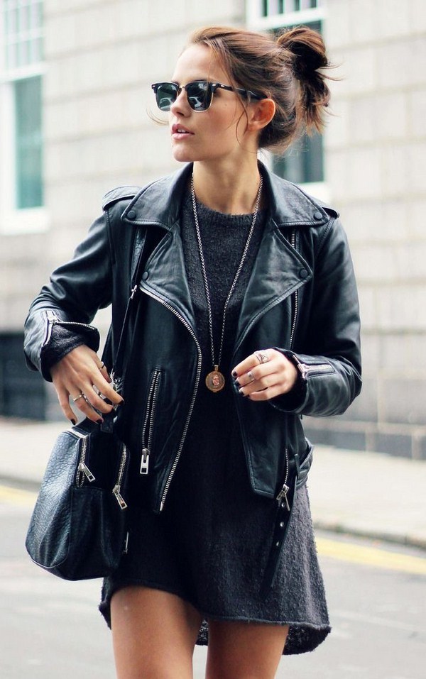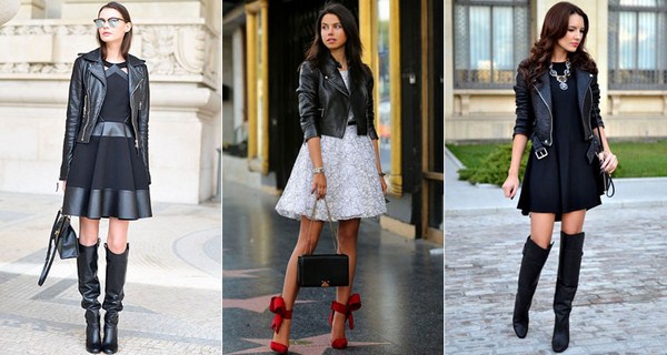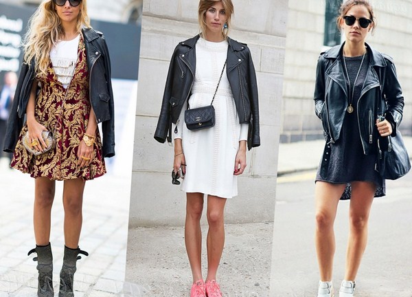 Des vestes en cuir élégantes sont parfaitement combinées dans des arcs de soirée à la mode avec des robes de styles différents et de beaux accessoires.