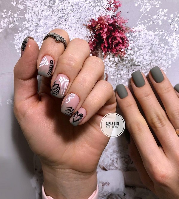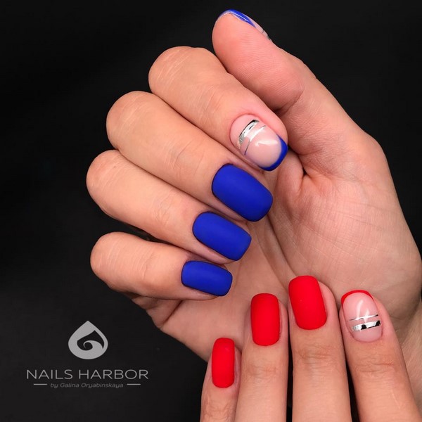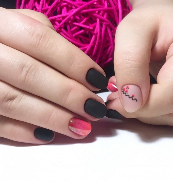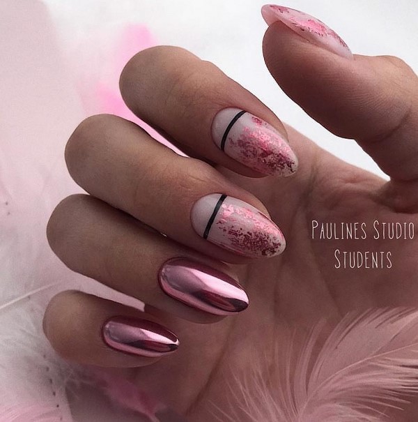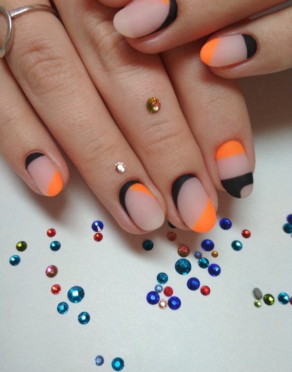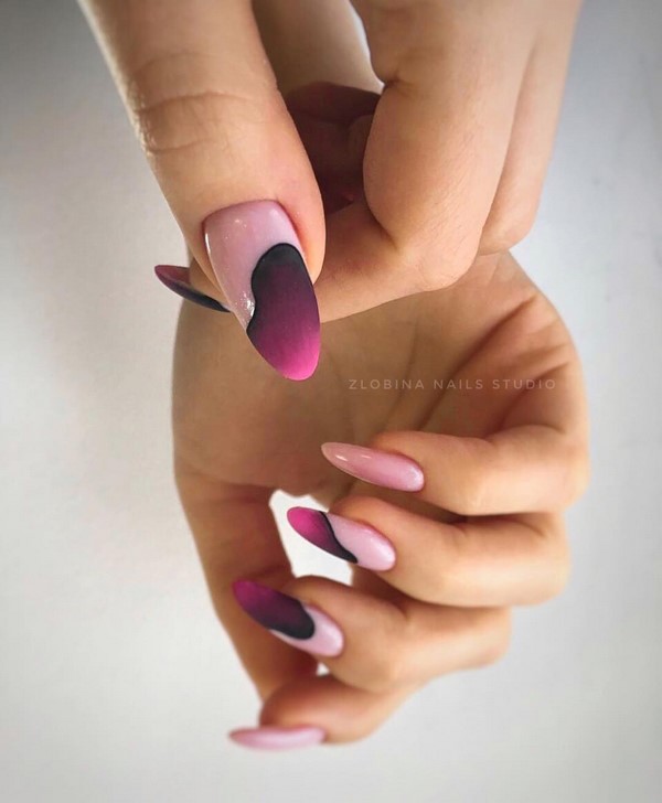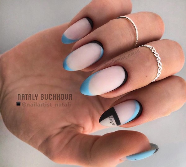 Les ongles créatifs à la mode de cette saison sont présentés dans un tandem de techniques de manucure française et lunaire. Le dessus mat, ainsi que des formes intéressantes de mise en valeur des lunes et des sourires, donneront effet à une telle combinaison de clous à manucure. Des ongles à la mode avec des maîtres lunaires et français proposent des couleurs différentes pour le polissage du gel, des trous et des sourires floraux, un «espace négatif» et des rayures.