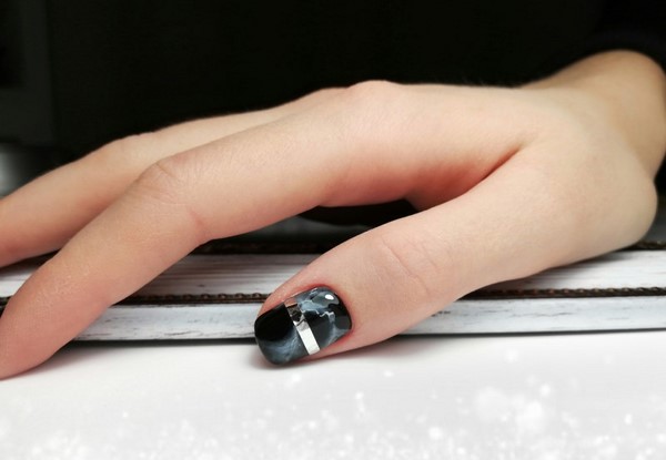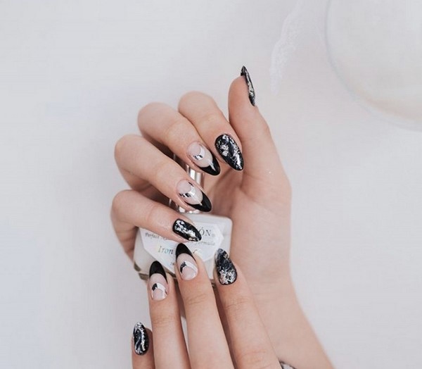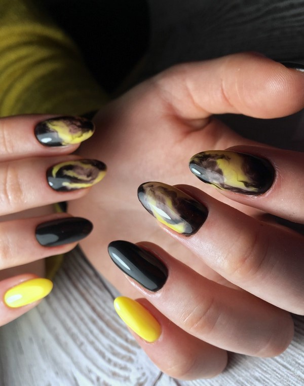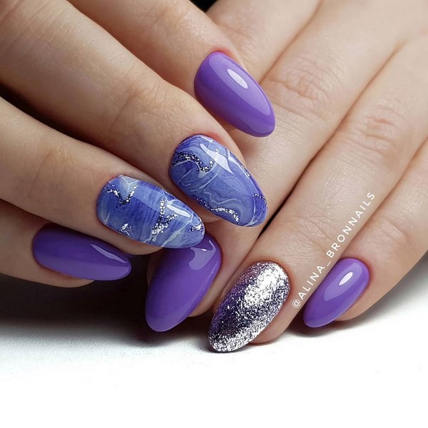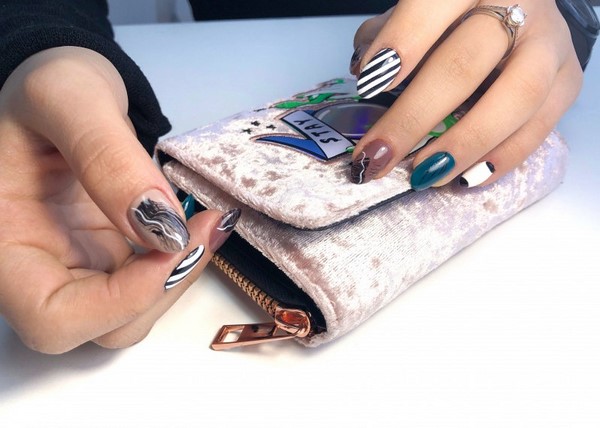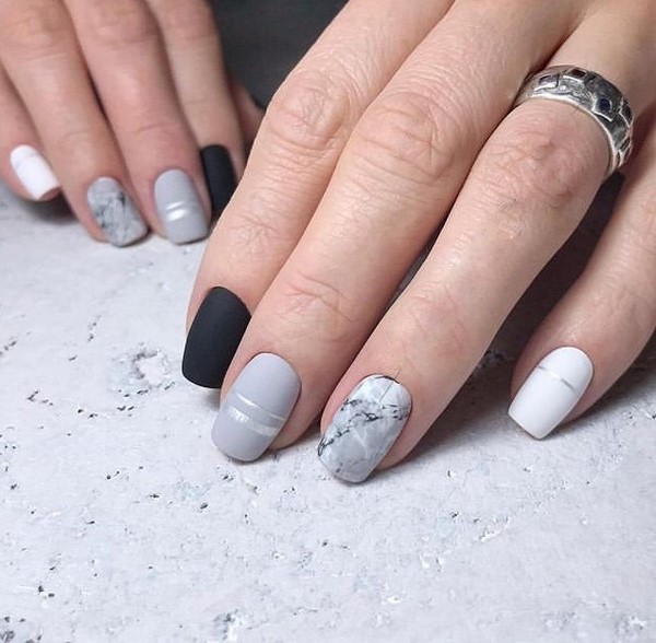 La délicatesse de la manucure en marbre à la mode facilite son insertion dans des images pour le bureau, ainsi que pour des ensembles de vacances. Des ongles à la mode de différentes longueurs ont fière allure dans un dessin d’ongle combiné avec des impressions sur marbre, des paillettes et du papier d'aluminium, ainsi que des tons contrastants de vernis gel. De charmants ongles en marbre ont l'air polyvalents et confortables.