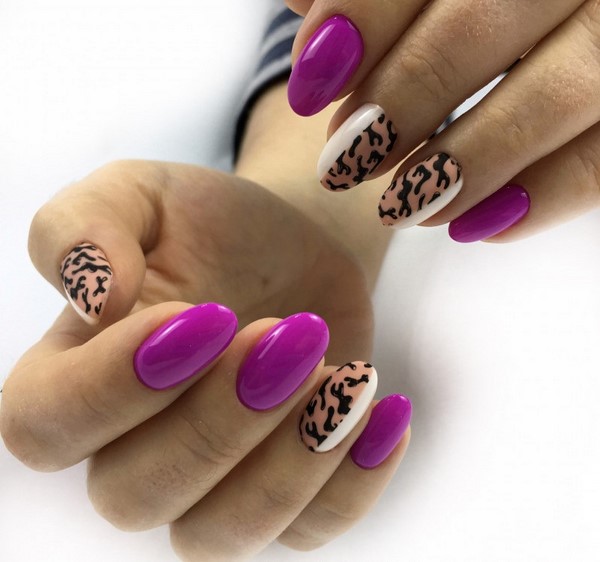 Une impression inhabituelle sur les ongles à la mode qui répète les motifs sur la peau des animaux deviendra une tendance à la mode dans la conception des nail art. Les grands professionnels de la manucure combinent audacieusement des ongles à la mode avec cette impression, ainsi que des ongles rouges, violets et bleus brillants, complétant ainsi le motif créatif avec des rayures et des brillants.
