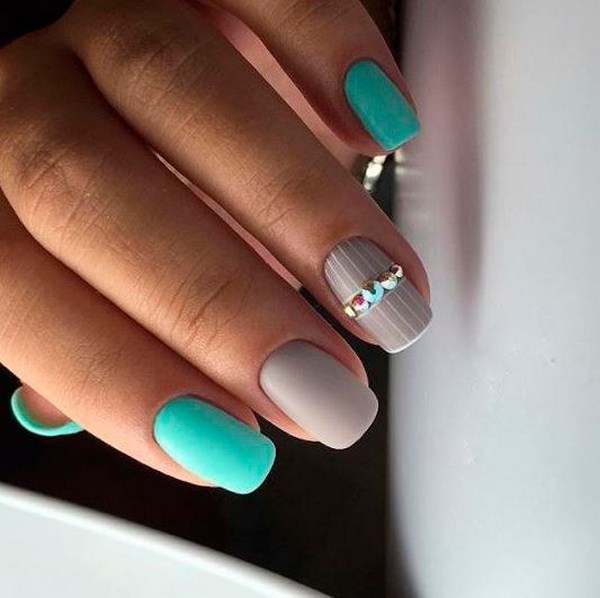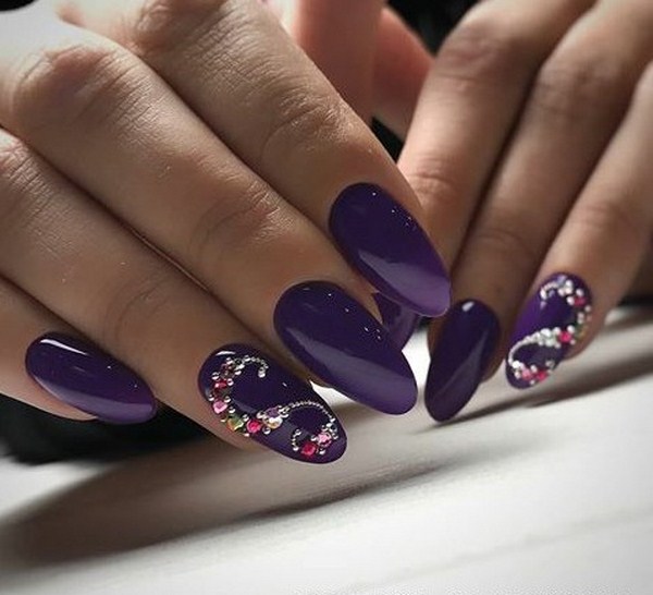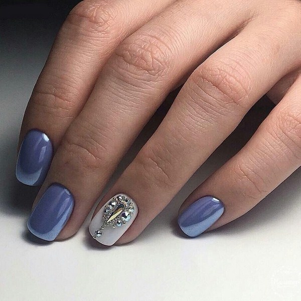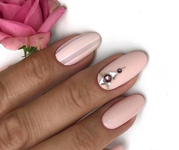 Une solution simple à une manucure à la mode sera monophonique avec un doigt souligné recouvert de pierres. Vous rencontrerez de nombreuses nouvelles manucures 2025-2026 avec des pierres au niveau du trou, sous la forme d'une bande, répétant les motifs sur les ongles et créant des impressions géométriques.