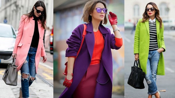 Les manteaux à la mode 2025-2026 ne sont pas moins spectaculaires dans une couleur brillante monophonique: nuances de citron, d'orange, de vert, de rose, de bleu.