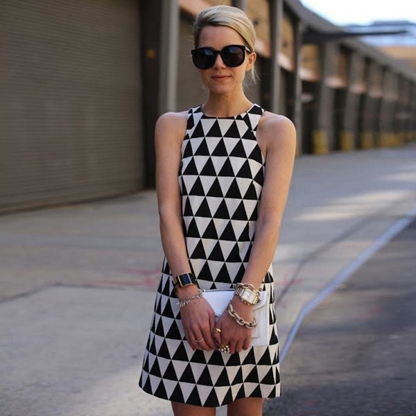 La robe classique et originale de l'affaire est présentée par des modèles sans manches et un col, une silhouette directement ajustée, une longueur juste au-dessus ou au-dessous du genou.