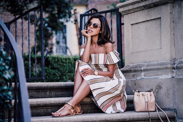 Pour une réunion romantique, il est préférable de compléter les robes à rayures dans une solution intéressante avec des volants ou des épaules abaissées - sandales à talons, semelles compensées et un petit sac à main.