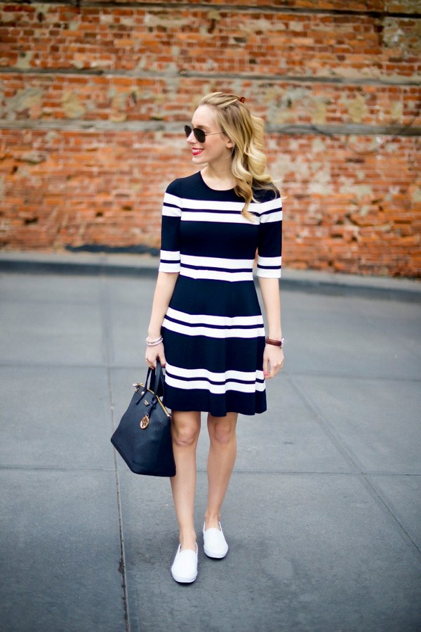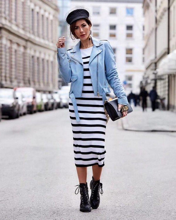 Les robes à la mode à rayures sont parfaites avec des baskets, des bottes et des ballerines. Sandales à la mode ou des sandales à basse vitesse, des compensés, la plate-forme sont également belles avec des robes à rayures.