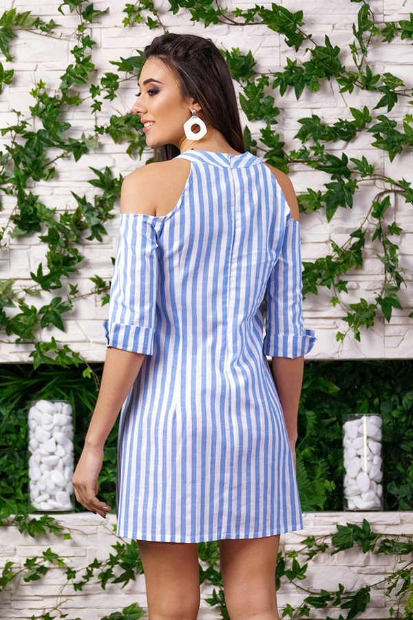 Des mini-robes à la mode avec une impression rayée sont montrées dans une version du gilet, qui aura l'air élégant avec des conversions ou des sandales plates légères. L'attrait donnera les épaules ouvertes, des découpes sur le dos et des volants.