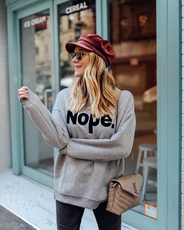 Du fait que les pulls molletonnés à la mode ne sont pas trop riches en divers décors, l’un des trucs à la mode était de décorer un sweat-shirt avec une inscription. Les marques de mode mettent très souvent sur leurs pulls le nom de leurs marques, motivant des slogans, et vous pouvez également rencontrer des inscriptions assez simples et simples, telles que les mots "Nope", "New York", "Boston".