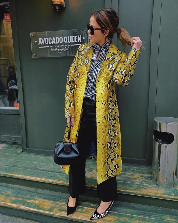 La tendance à la mode des imperméables de la saison prochaine est le cuir, qui peut être très différent, à la fois en couleurs et en imprimés. Vous pouvez choisir un manteau en cuir à la mode pour le python, et même une impression aussi extraordinaire est proposée en vert clair et en couleurs non moins vives.