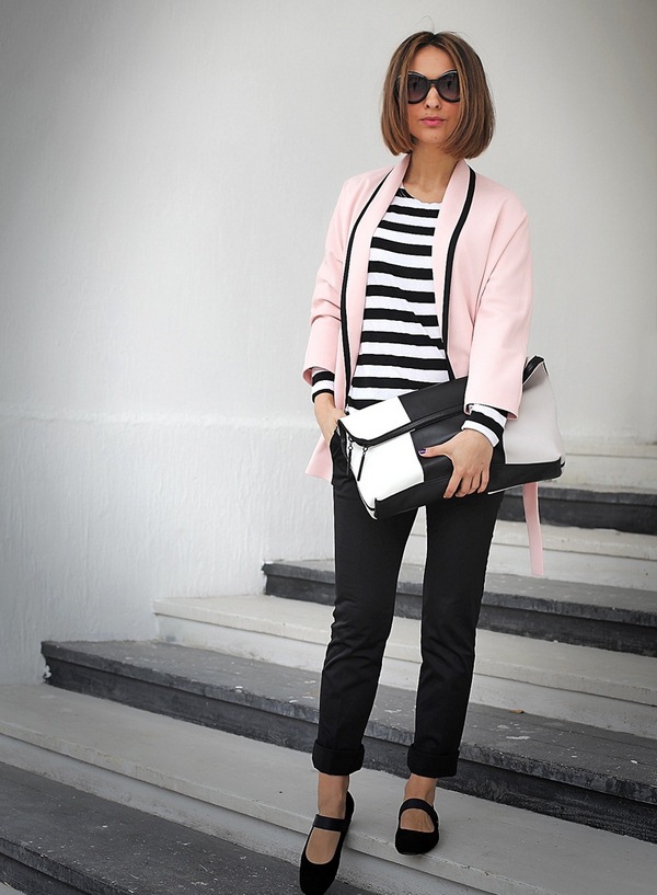 Sinon, si vous préférez un haut brillant ou un pantalon coloré, un short, une jupe, puis, à la fin du look, choisissez les tons apaisants d'une veste en blanc, noir et couleurs pastel.