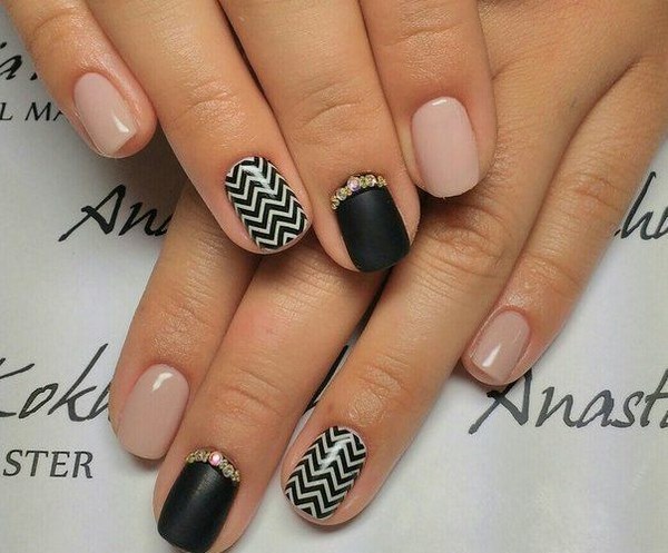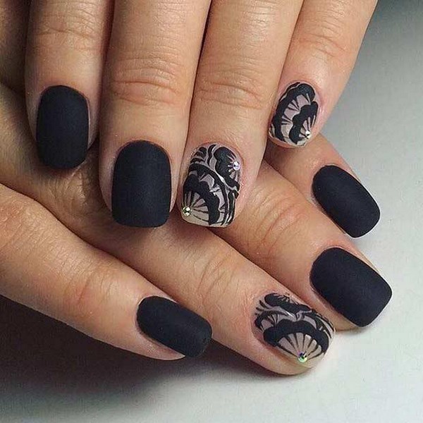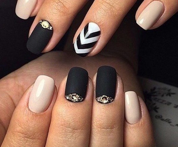 La manucure noire mate a une allure irréprochable avec des ornements en strass, dont le lustre est particulièrement beau en plus du vernis noir mat en sourdine. Manucure noire mate raffinée et élégante combinée avec des nuances beiges de vernis mat qui a l'air mignon.