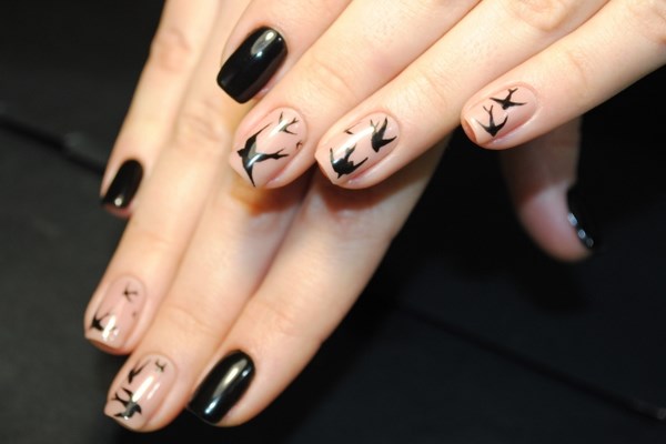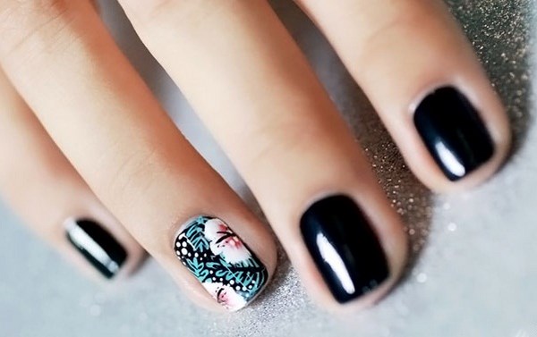 Ainsi, pour créer une manucure noire à la mode, vous pouvez prendre de jolis dessins de papillons ou de fleurs sur un ou deux doigts, en les complétant avec des cailloux laconiques.