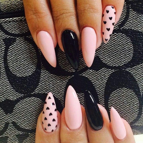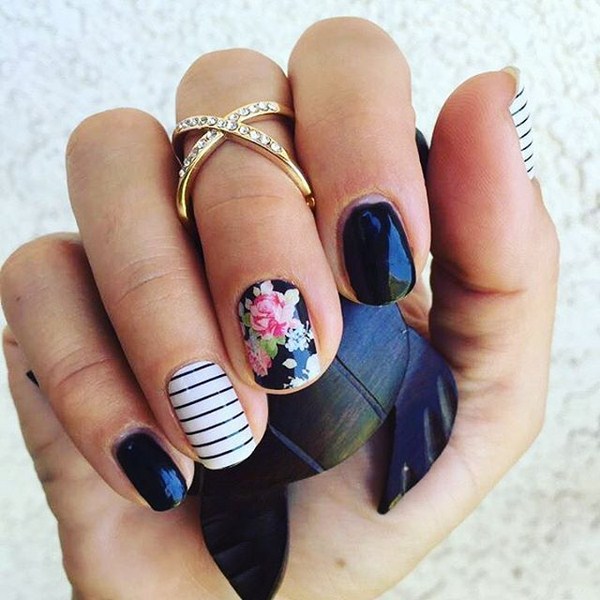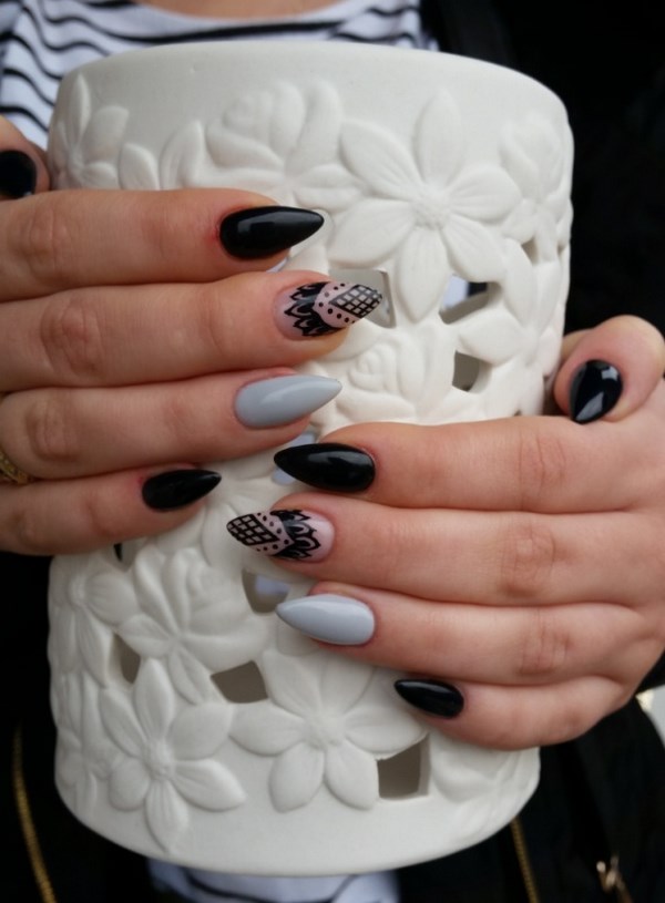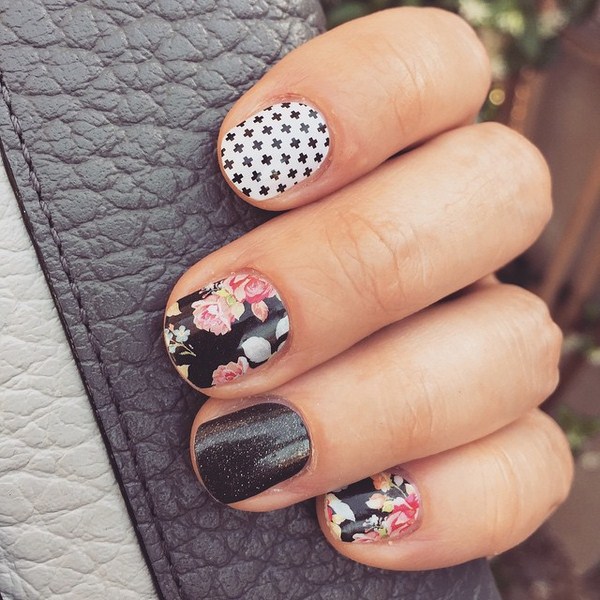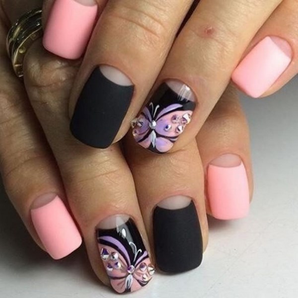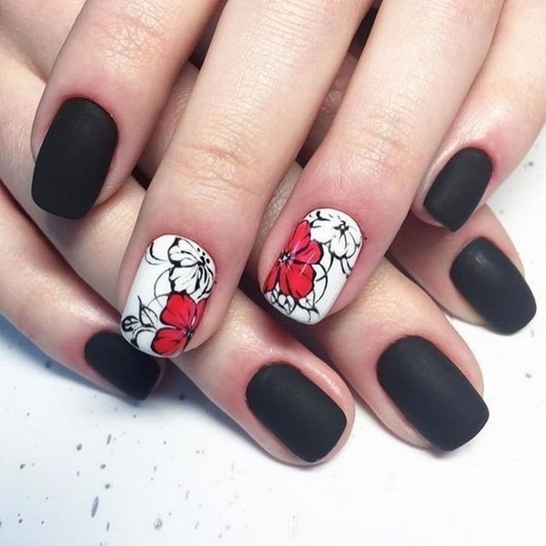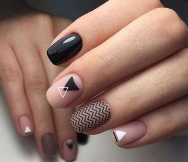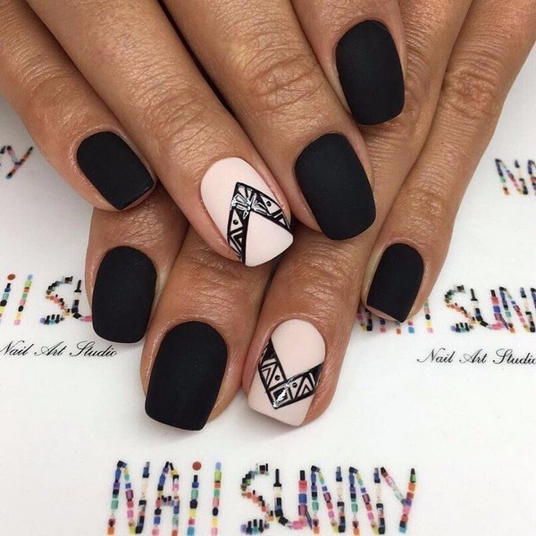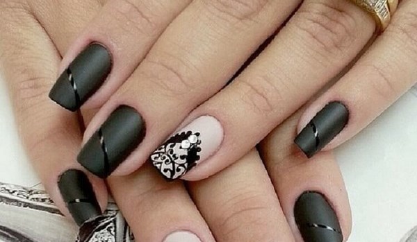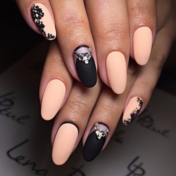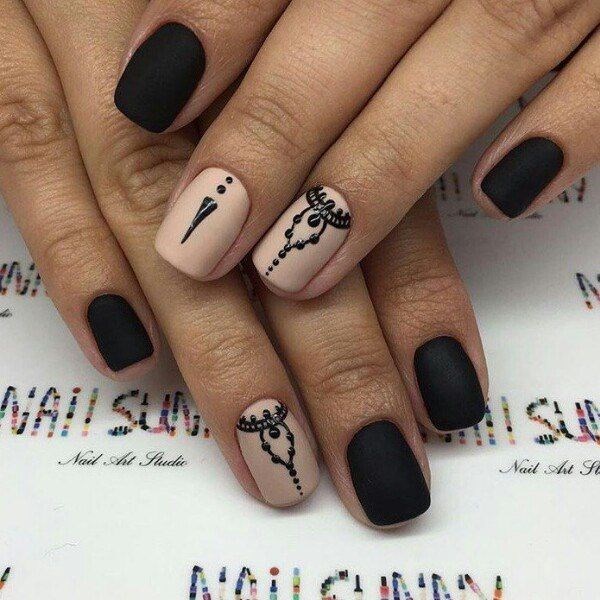 Une version exquise de la manucure noire avec une finition mate, faite sur plusieurs ongles, et le reste complète avec un vernis mat en pêche ou rose pâle.