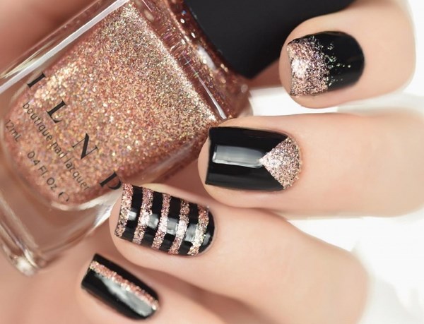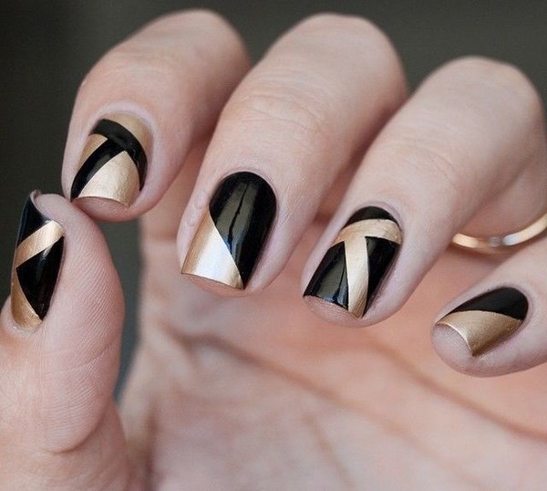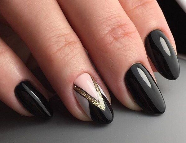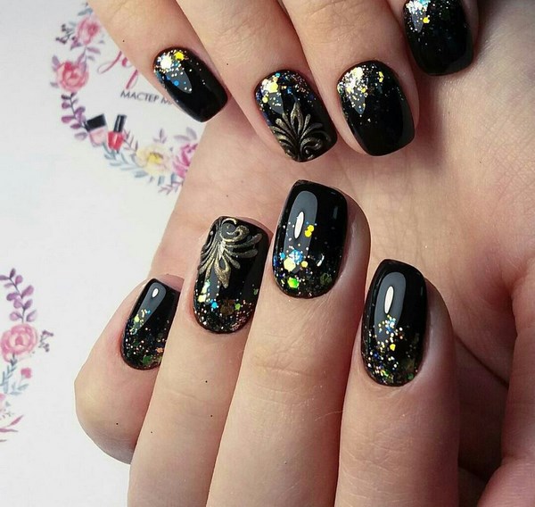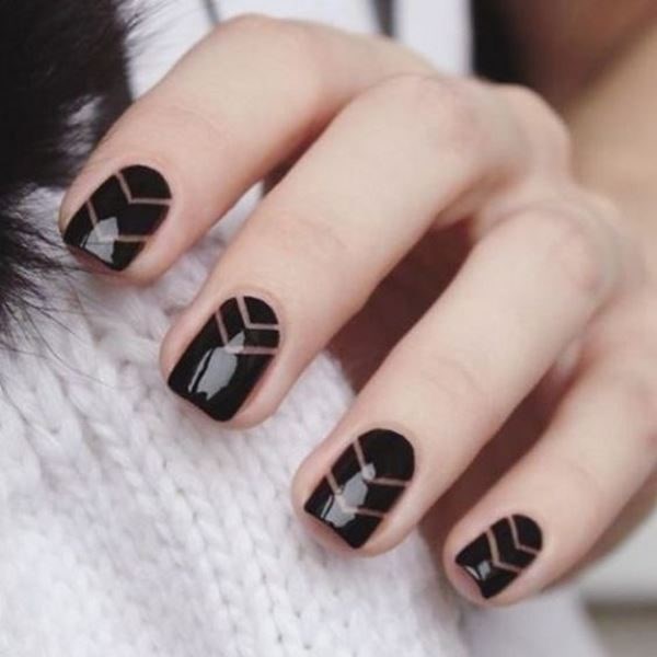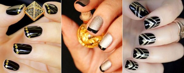La manucure noire à la mode pour la soirée peut être réalisée avec des rayures dorées et argentées, divers frottements et dessins laconiques qui «raviveront» la manucure avec de la laque noire.