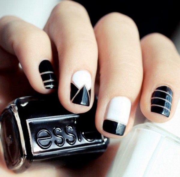 Les motifs minimalistes sur les ongles en noir sont magnifiques, divers motifs géométriques, ainsi que certains ongles, soulignés en laqué blanc avec un motif, des rayures et des strass.
