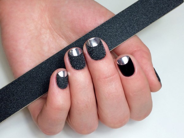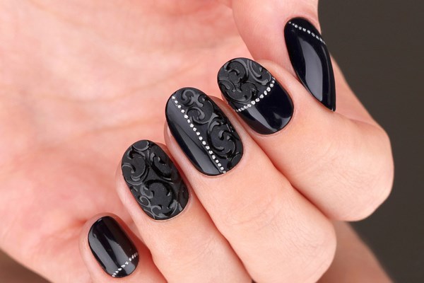 Une version intéressante de la manucure noire, réalisée à l'aide de la technique d'estampage, qui aidera à créer des motifs sophistiqués sur les ongles avec un vernis noir.