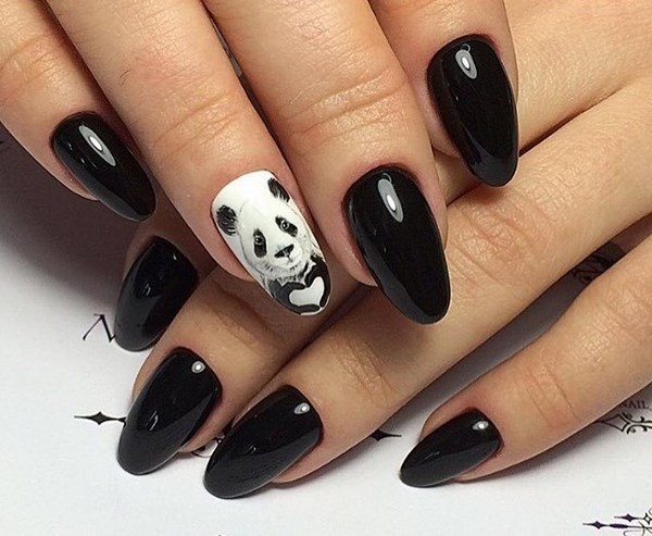 Pour les filles qui souhaitent effectuer une manucure noire originale, nous vous suggérons de choisir une manucure noire avec un joli panda, des motifs géométriques sur les ongles noirs, et pour les filles romantiques une manucure noire avec des roses délicates.