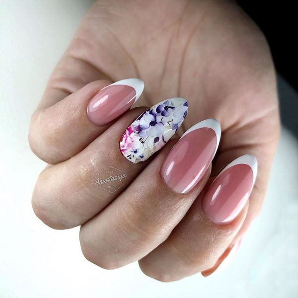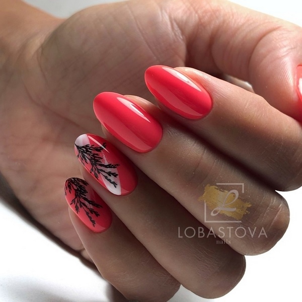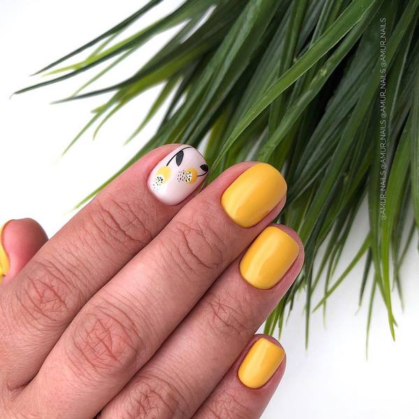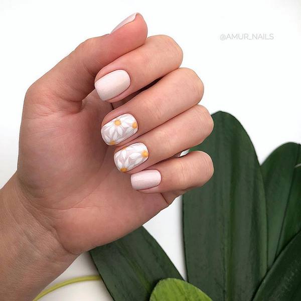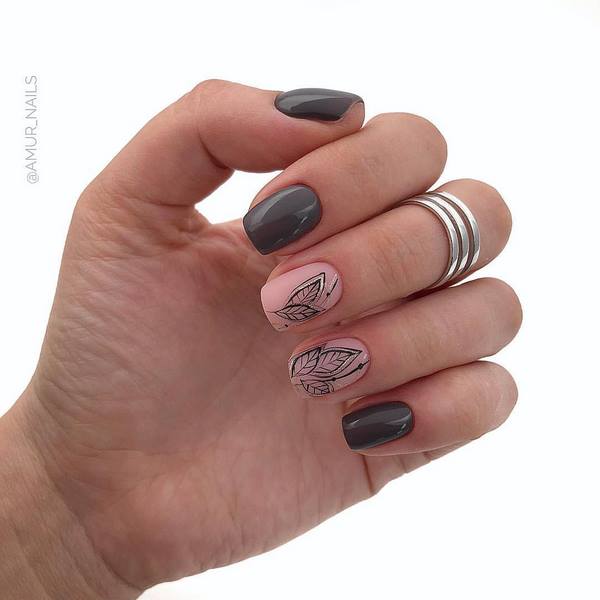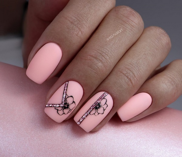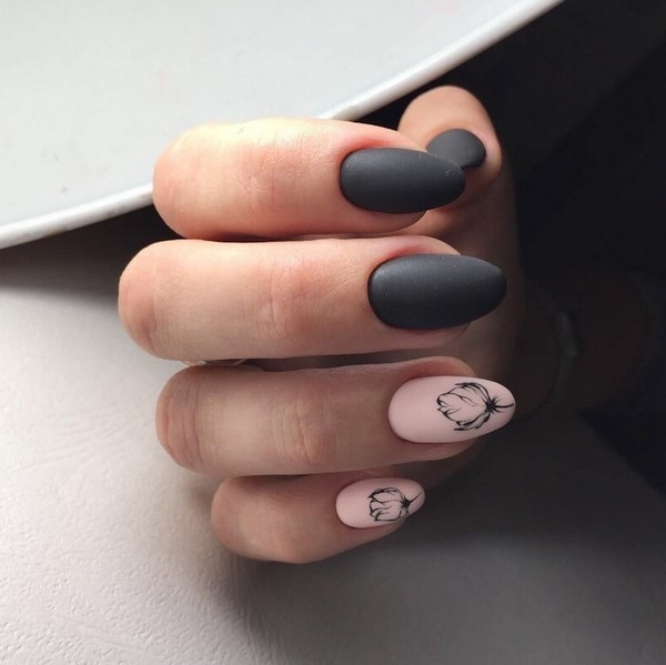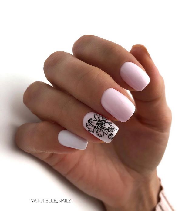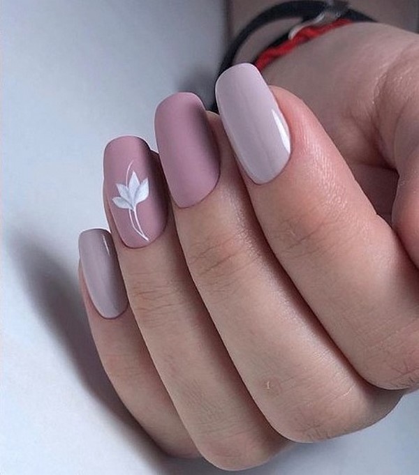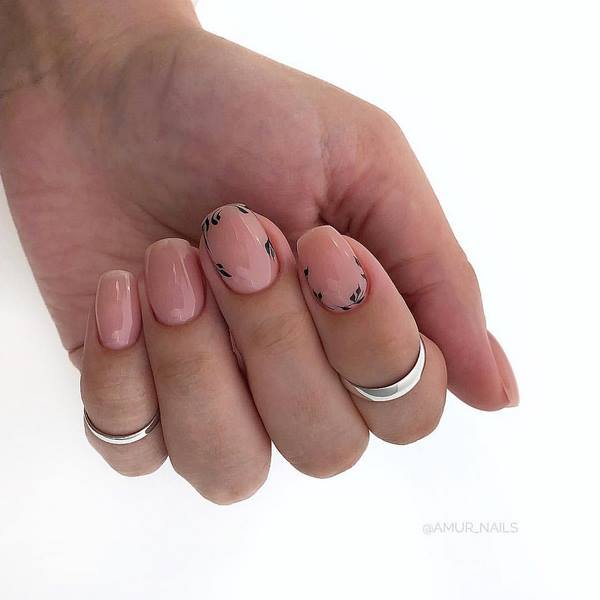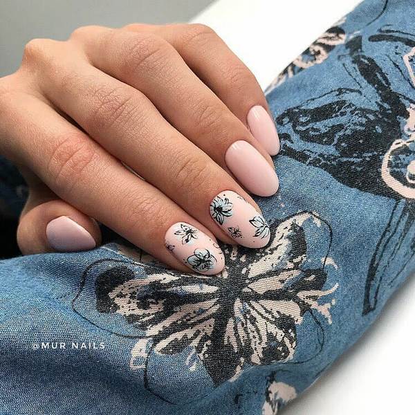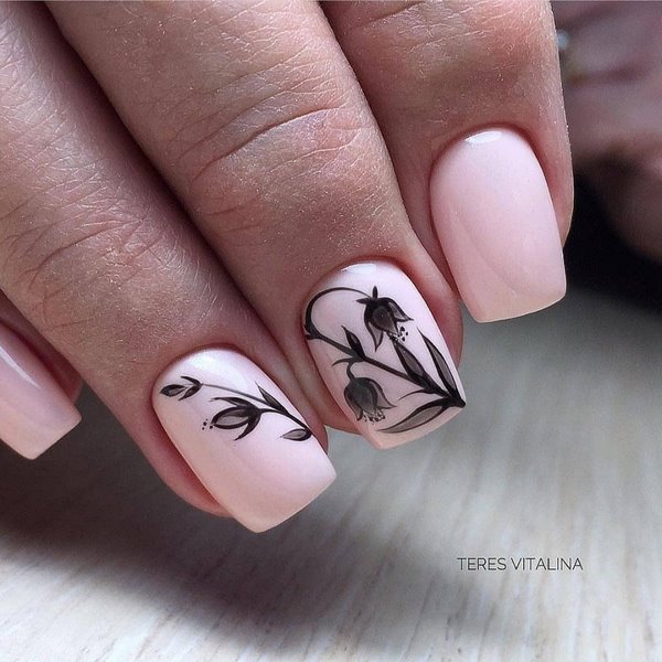 Une manucure à la tendance minimaliste a l’air particulièrement mignonne avec ses petites branches et ses boutons floraux, qui se présente sous la forme d’un accent sur quelques ongles. Vous pouvez implémenter mode manucure minimaliste avec une fleur sur l'anneau ou le pouce, donnant de l'expressivité à l'aide d'une nuance plus saturée d'autres ongles.