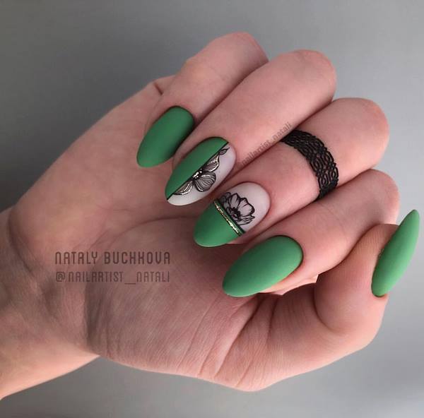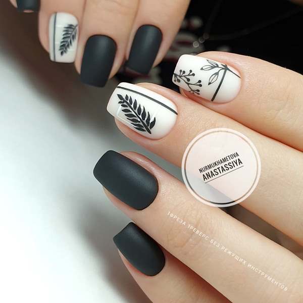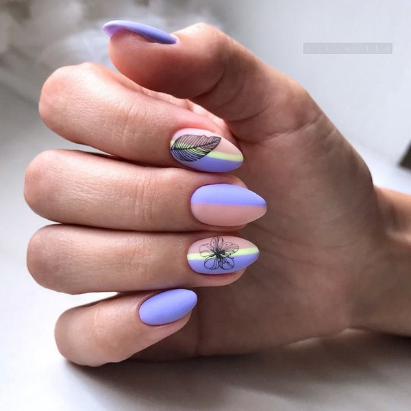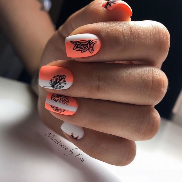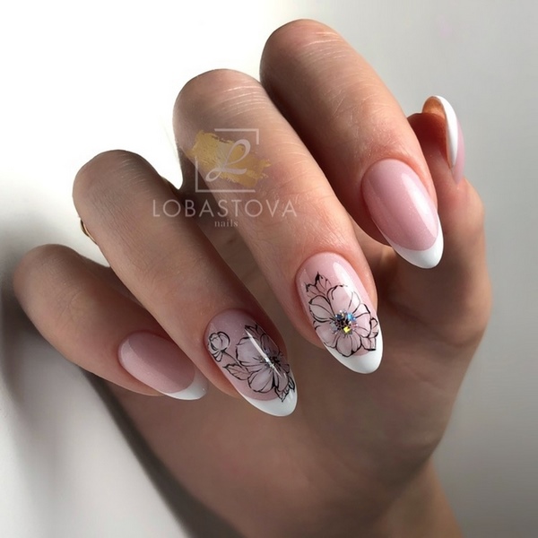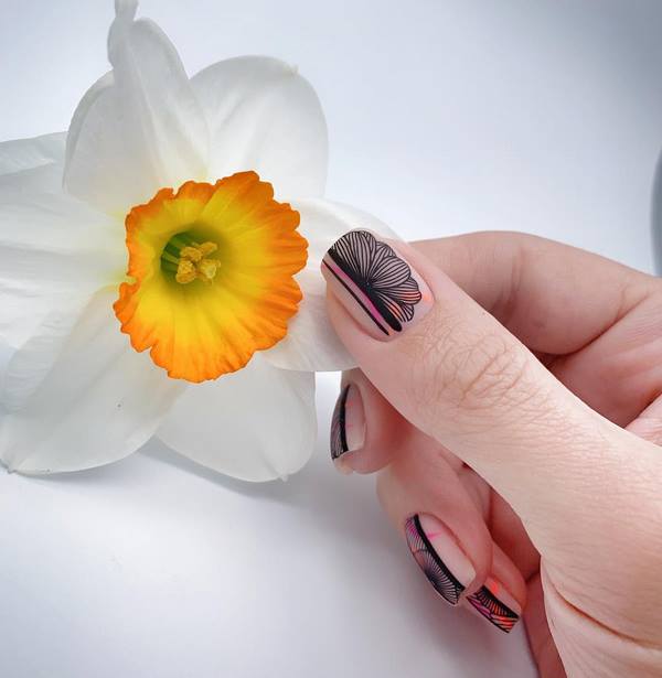 La manucure dite "à moitié" est devenue à la mode quand la moitié du souci reste non peinte avec un revêtement de couleur. En plus de cette conception, les maîtres proposent de peindre des fleurs et des rayures, ce qui permettra de réaliser une manucure florale très créative et à la mode 2025-2026.