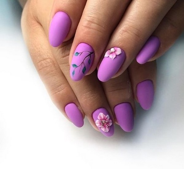 Une manucure florale avec des motifs floraux volumineux sur les ongles, réalisée selon la technique de sculpture, sera incroyablement belle et chic. Cette conception d'ongle floral peut être complétée par un frottement de perles qui donnera un éclat léger. Manucure florale à la mode sculptant avec un effet mat et ombre a l'air sympa.
