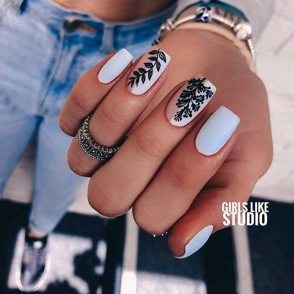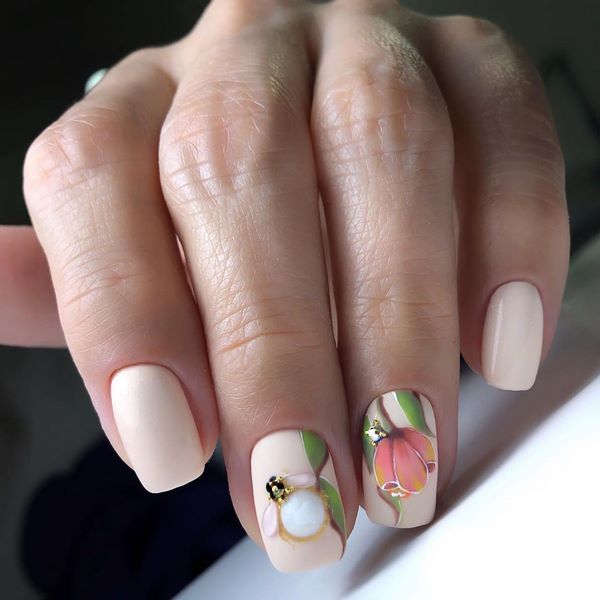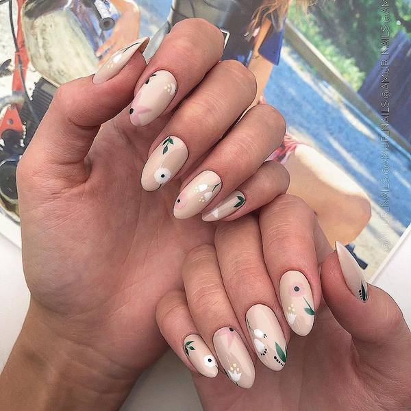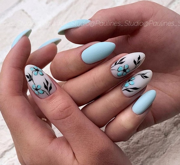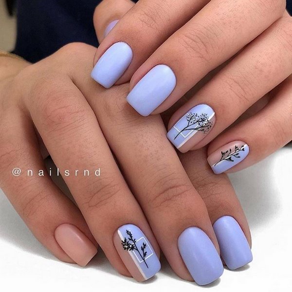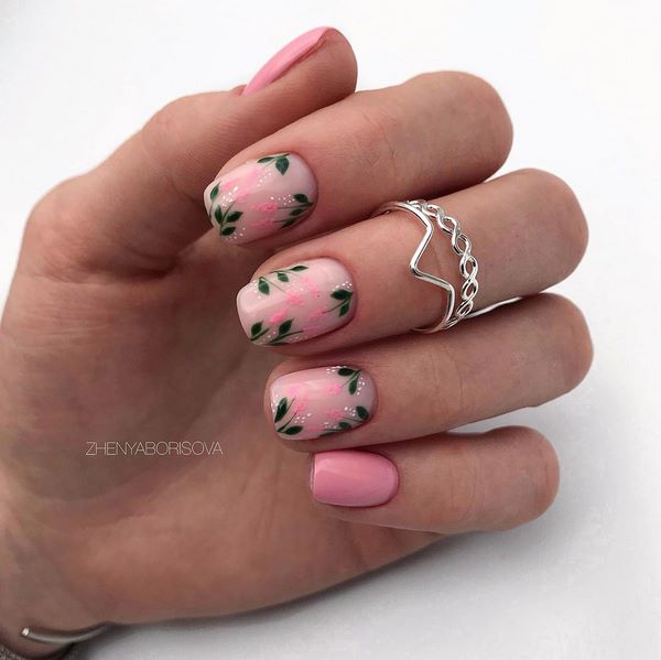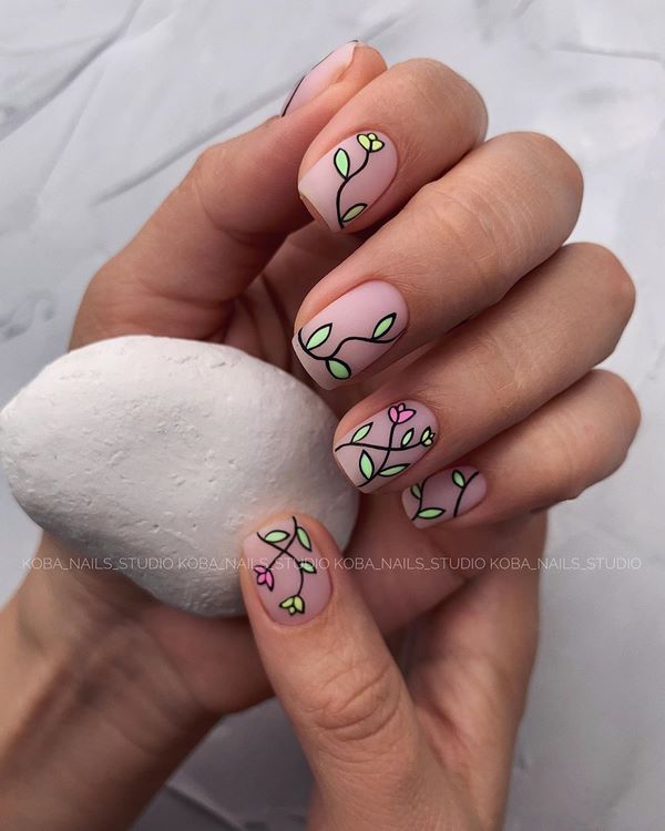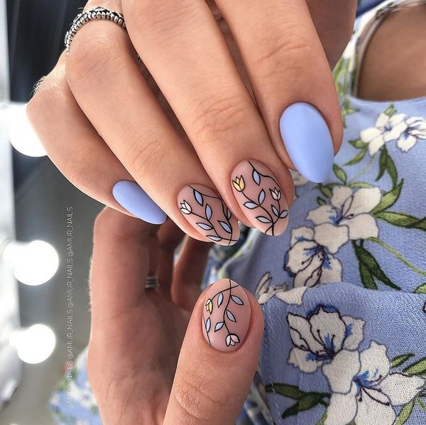 De nombreuses idées de manucure "fleuristerie" ne sont pas présentées uniquement avec des dessins floraux. Les images de brindilles, de feuilles exquises et de boutons ont gagné une popularité incroyable, ce qui crée une sensation de légèreté et d'apesanteur dans une manucure florale à la mode de cette saison.