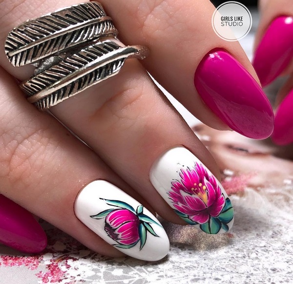 Que devrais-je rechercher lors du choix d'une manucure florale à la mode pour la prochaine saison? Et ainsi, les nouvelles tendances dans la conception des ongles dans une fleur ne seront pas aussi voyantes et lumineuses, comme nous l’avions déjà observé.