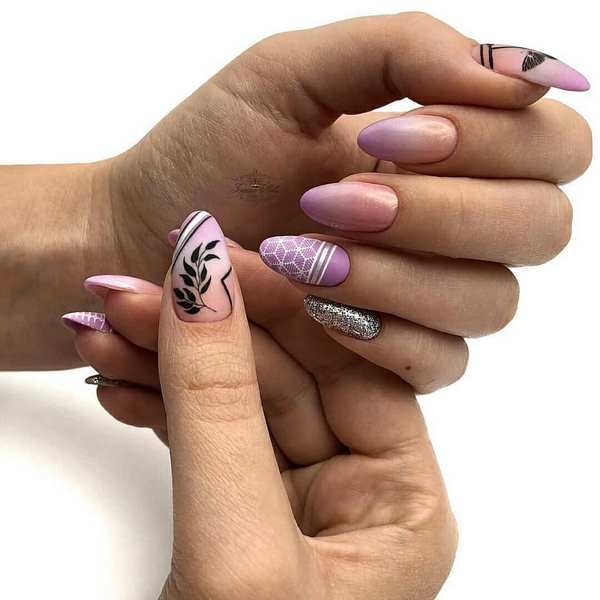 Le style de manucure à fleurs combinées gagne de plus en plus en popularité, étant représenté par une grande variété d'options de conception des ongles, qui utilisaient plusieurs techniques et éléments décoratifs à la fois. La veste avec des fleurs, dégradé floral, manucure florale avec des rayures, complétée par des étincelles et kamifubuki deviendra élégant et attrayant.