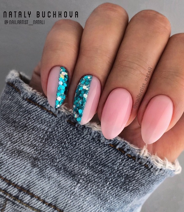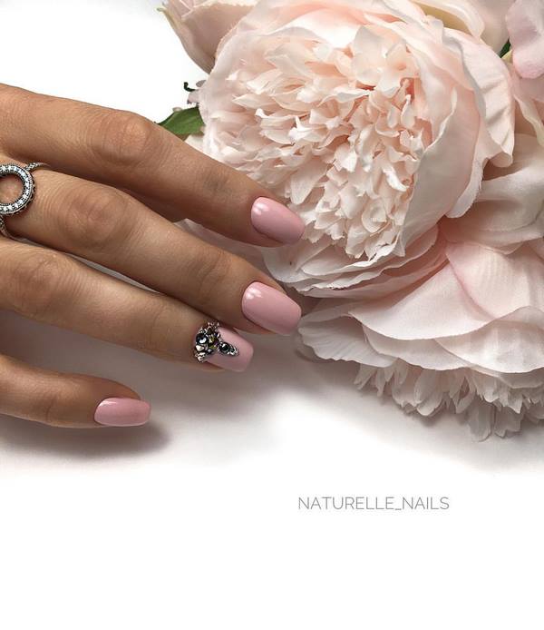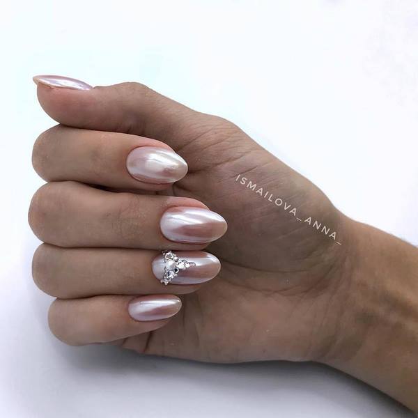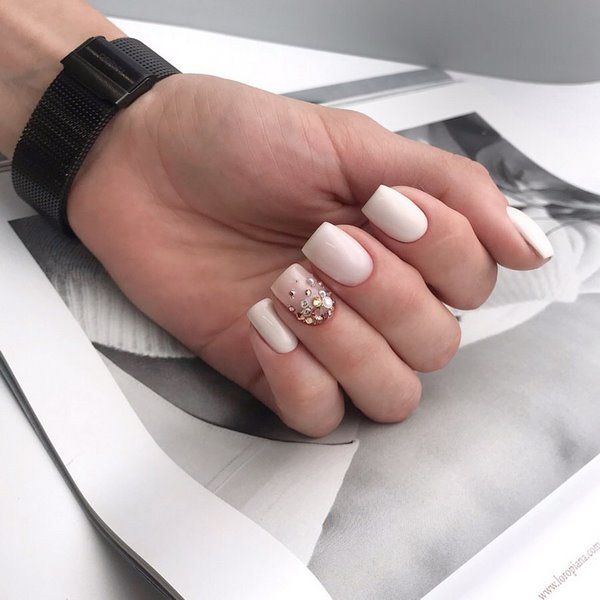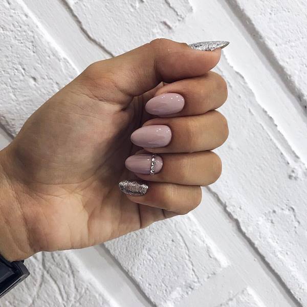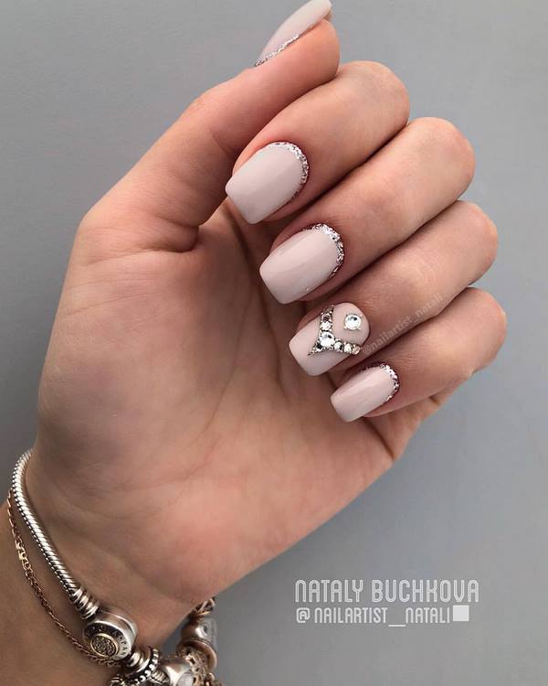 Un décor chic et brillant dans une manucure de fête sur les ongles moyens est représenté par les strass, qui sont les meilleurs pour accentuer un ongle unique en forme de couronne ou pour créer une belle dispersion de copeaux de cristal sur le même doigt dans un design à la mode avec des strass de ongles moyens.