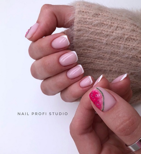 La conception classique du nail art sous la forme d'une veste à la mode sera très belle sur la longueur moyenne des ongles, étant représentée par les variations délicates et stylées de la manucure française. Les maîtres proposent de diversifier la veste sur les ongles moyens avec des dessins d'accent de fruits, ainsi que les pointes scintillantes des ongles sous forme de grosses paillettes.