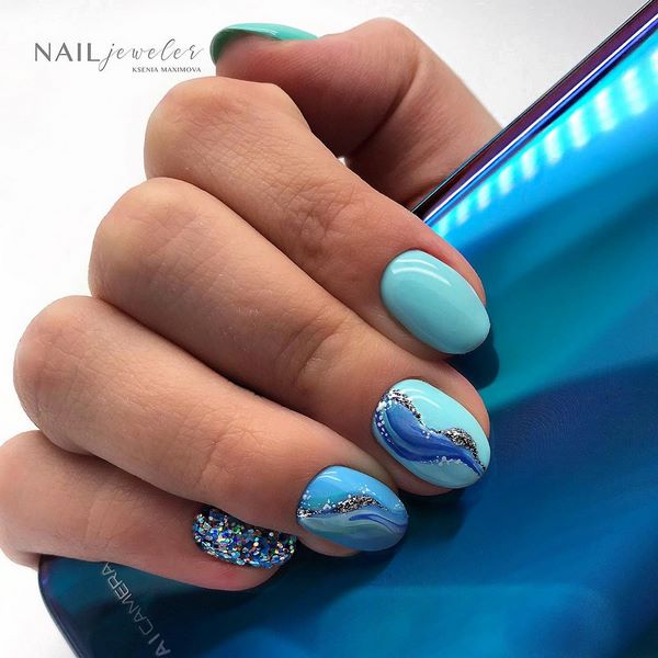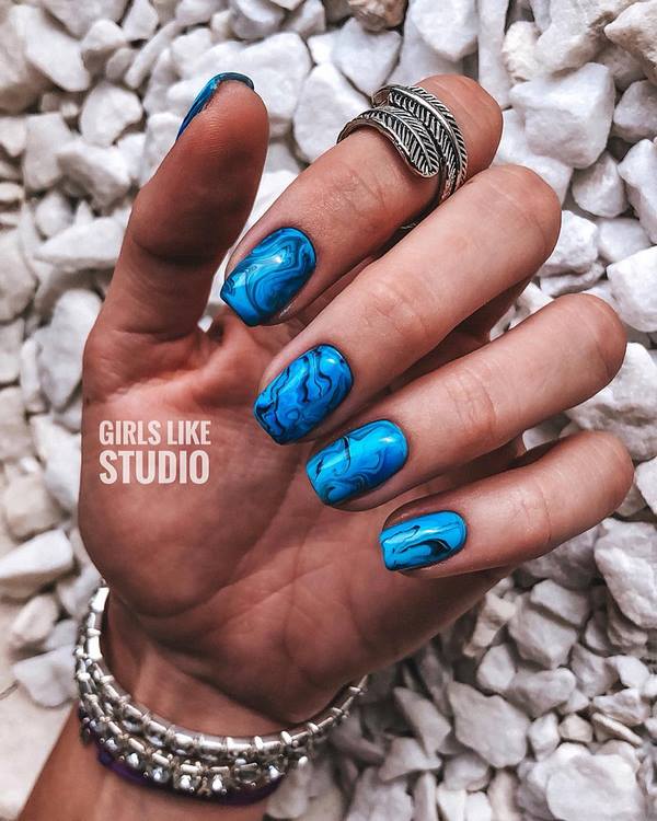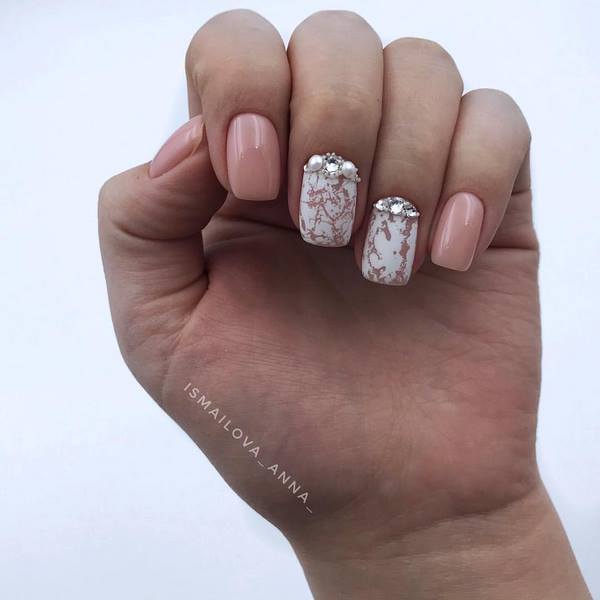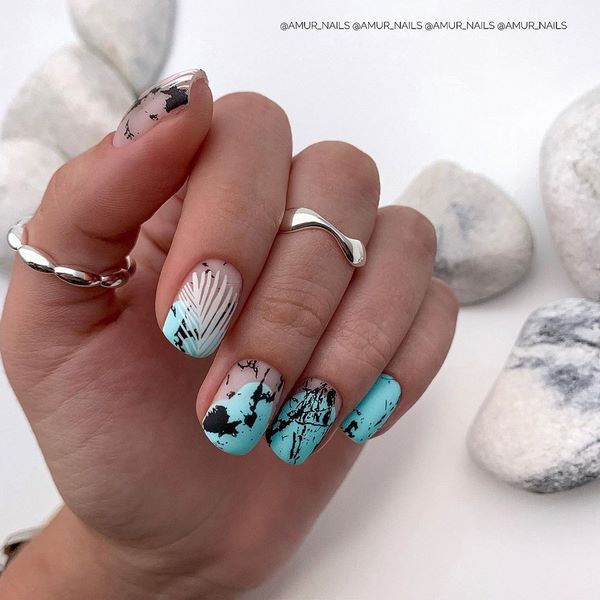 Des motifs captivants qui ressemblent à des pierres précieuses et à des minéraux naturels - quartz et marbre - deviendront une nouvelle idée pour la décoration des ongles. Les masters offrent des débordements lumineux d'étincelles et de «textures naturelles» sur un ongle ou deux doigts larges, présentant une manucure tendance pour les ongles moyens utilisant la technique des «textures naturelles».