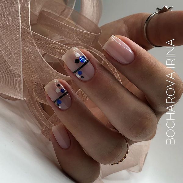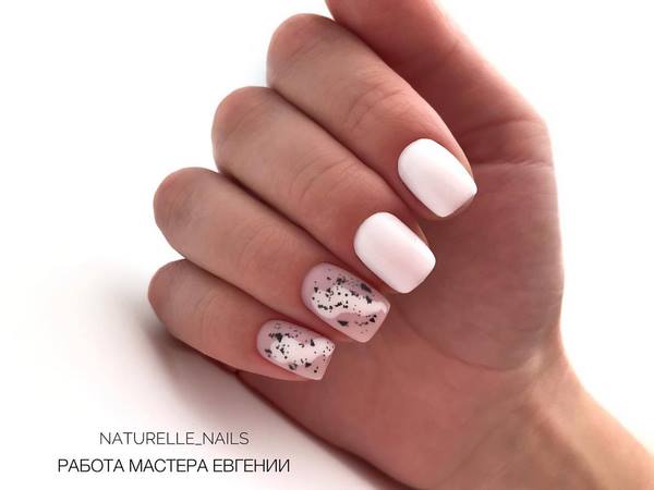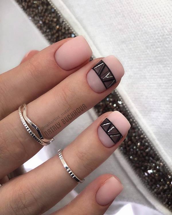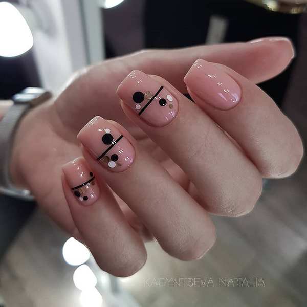 Nous ne rencontrons pas kamifubuki pour la première fois, mais seulement cette fois-ci, nous proposons de réaliser une manucure à la mode sur des ongles moyens avec des rayures et des confettis monochromes dans une ou deux nuances, ce qui donnera un aspect élégant à la conception nude des ongles moyens.