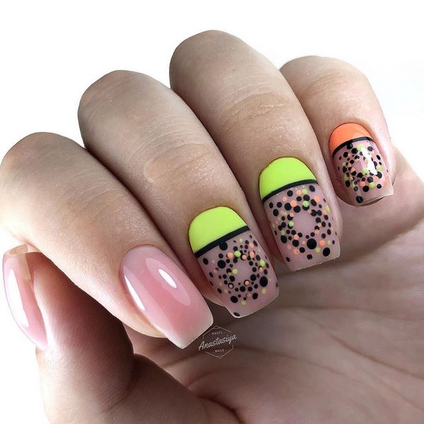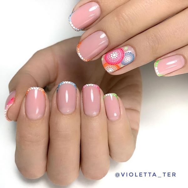 Plus tôt nous avons considéré manucure de mode "point de douleur" ou la conception des ongles avec des points, et maintenant nous proposons de créer un motif de points en utilisant la conception des points sur les ongles moyens. De beaux points multicolores dans la conception de points vous permettront de mettre en évidence les pointes des ongles, créant ainsi un manteau français, et la combinaison de points sur l'annulaire ressemblera à des fleurs, vous permettant de réaliser un dessin magnifique et à la mode des ongles moyens.