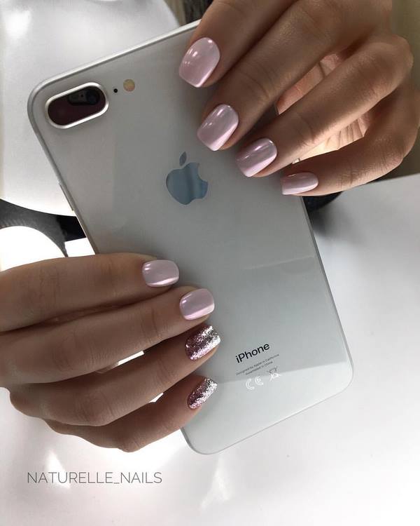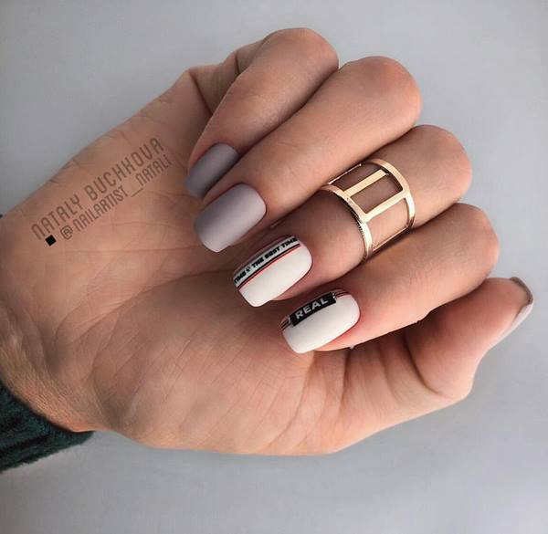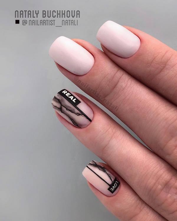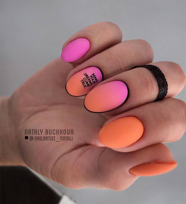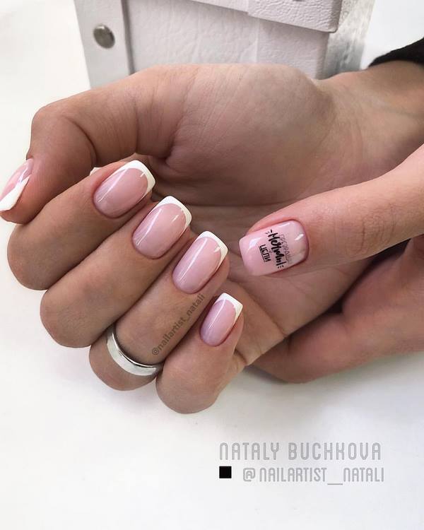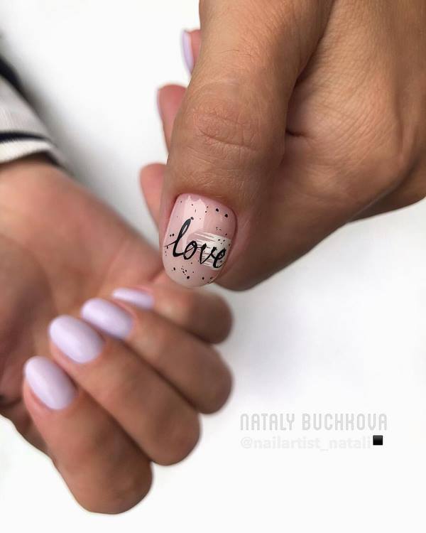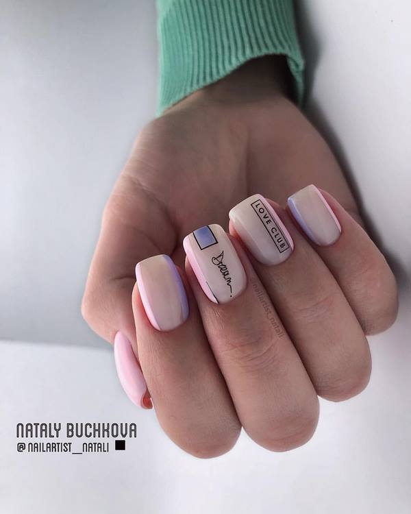 Un très beau dessin d’ongles est proposé sur les ongles moyens dans le style du lettrage ou, en d’autres termes, des inscriptions sur les ongles. Les Maîtres offrent un beau motif ombré brillant sur les ongles moyens à compléter avec un cadre sur quelques ongles et une inscription sur un doigt d'accent. Une telle manucure à la mode sur les ongles moyens a l’air très frais et d’une nouvelle façon.
