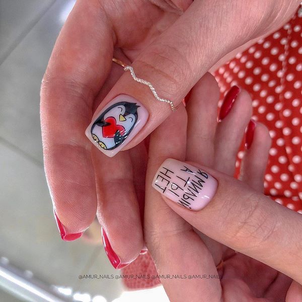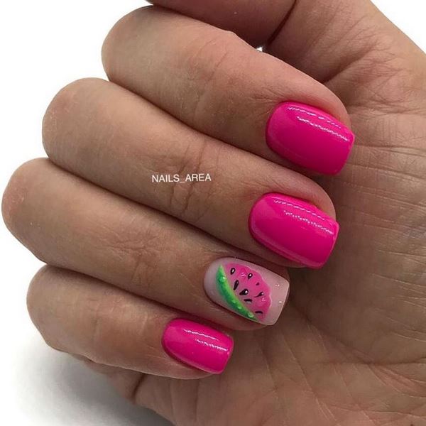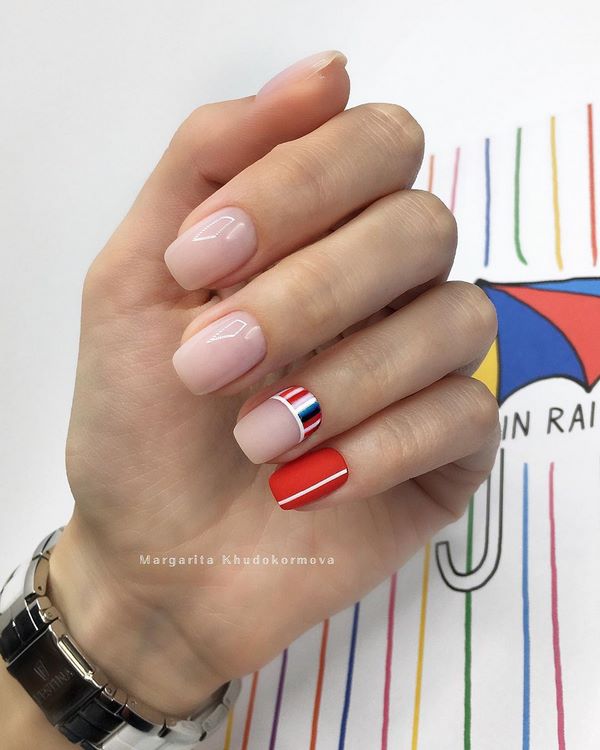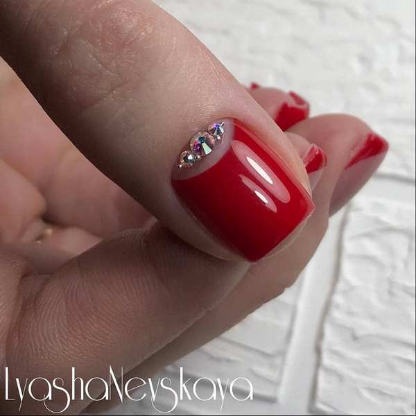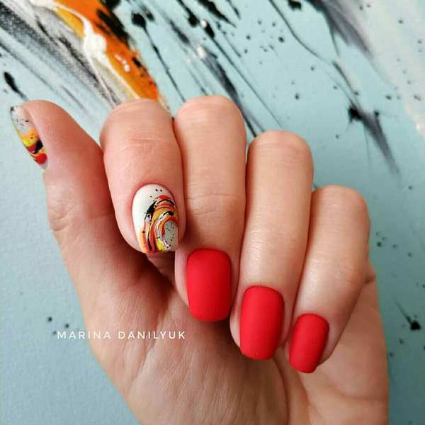 La tendance de la mode dans la conception des ongles moyens a été proposée par des spécialistes des ongles en mettant l’accent sur le pouce. Vous voulez, vous pouvez exécuter des dessins de fruits délicieux, ou peut-être dépeindre un mignon Mickey Mouse? Toute impression sera magnifique sur les pouces dans une manucure à la mode sur des ongles moyens, qui peut être faite monochrome en rouge.
