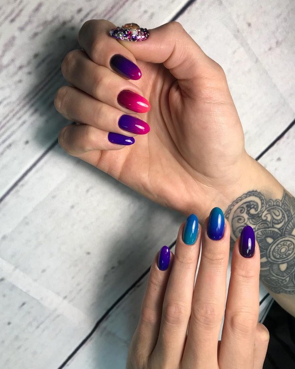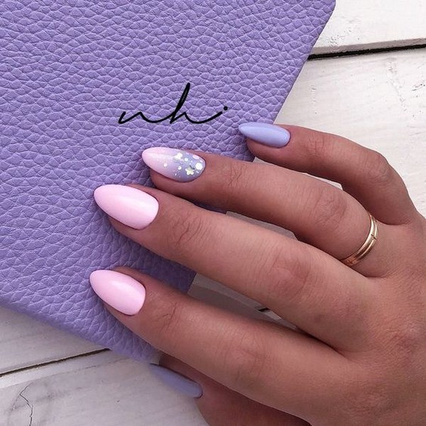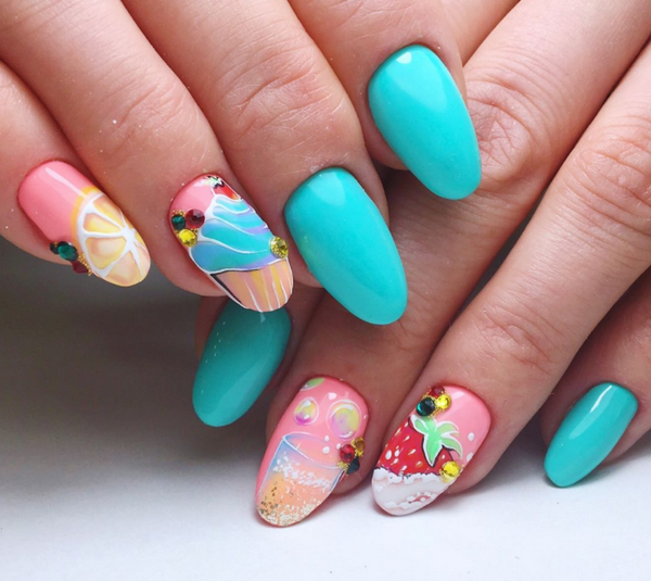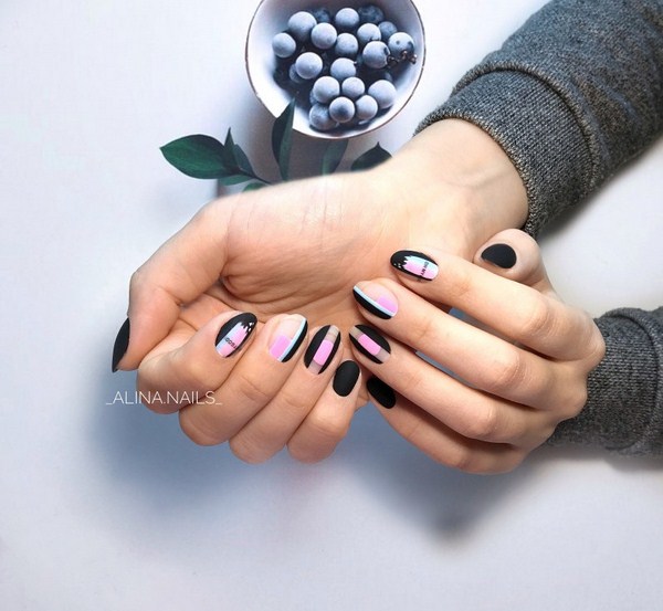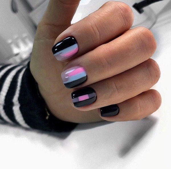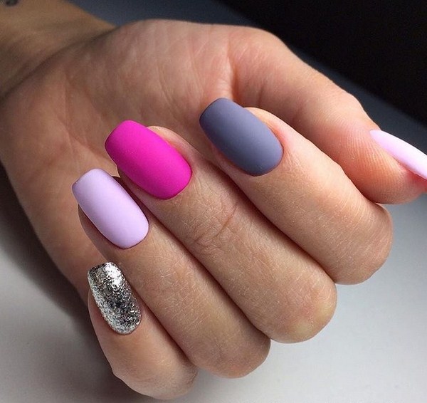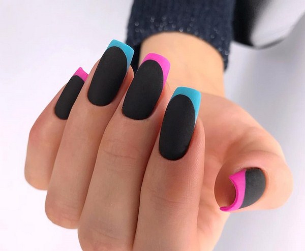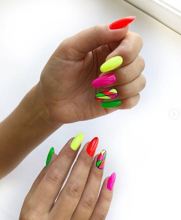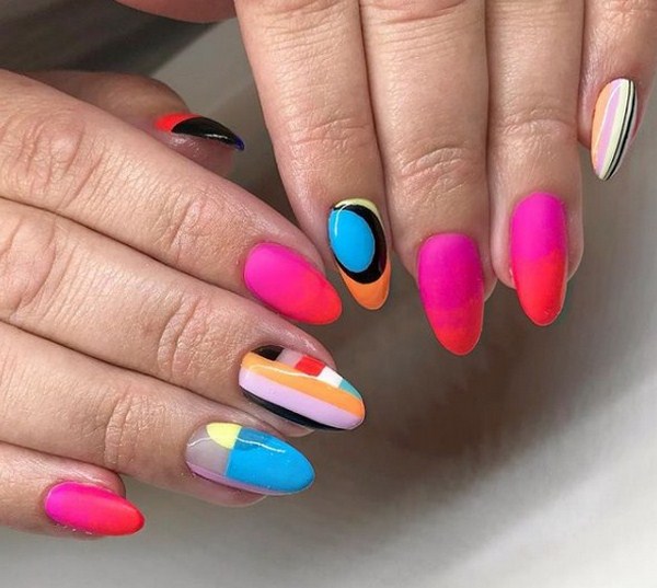 Si vous souhaitez obtenir la manucure printemps-été la plus brillante, où il y aura plusieurs nuances de vernis acides et méga-à la fois, la technique de bloc de couleur permettra de réaliser un tel motif dans sa meilleure forme. En divisant l'ongle en plusieurs secteurs remplis de vernis multicolores, vous obtenez un dessin d'ongle printemps-été très original et non trivial dans une forme lumineuse.
