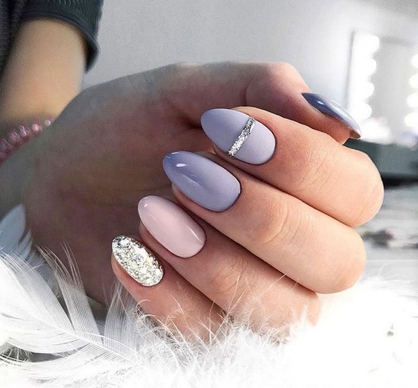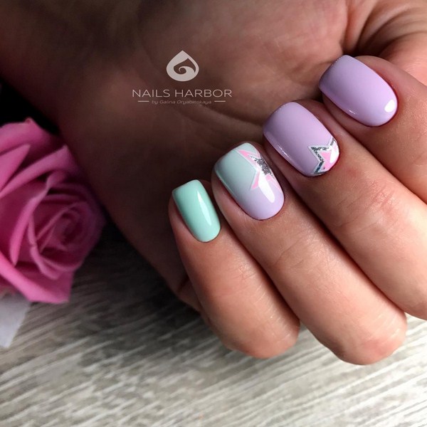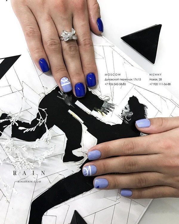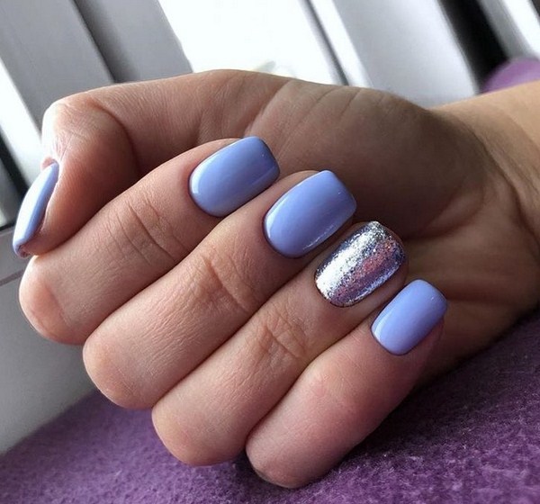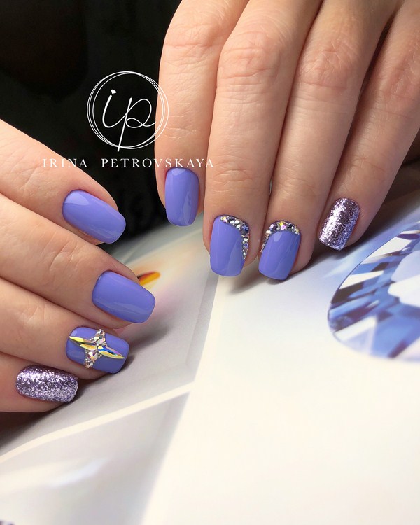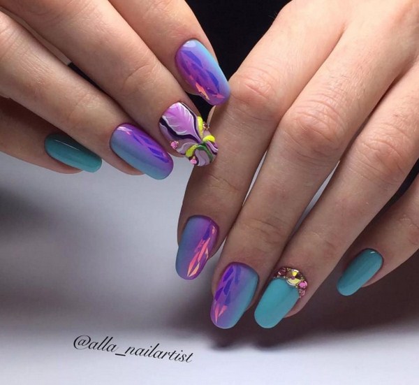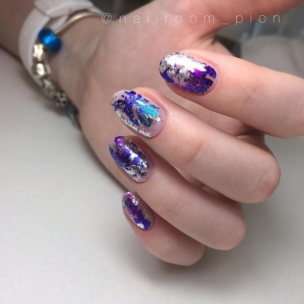 La technique de manucure attrayante et excitante printemps-été peut être réalisée avec la technique du verre brisé. Pour ce faire, il est important de choisir des teintes vives du revêtement, telles que le bleu, le lilas et le violet, afin de créer une étendue de couleur, complétée par des morceaux de feuille, qui simulent des morceaux de verre sur les ongles dans le design à la mode «verre brisé» du printemps ou de l’été.