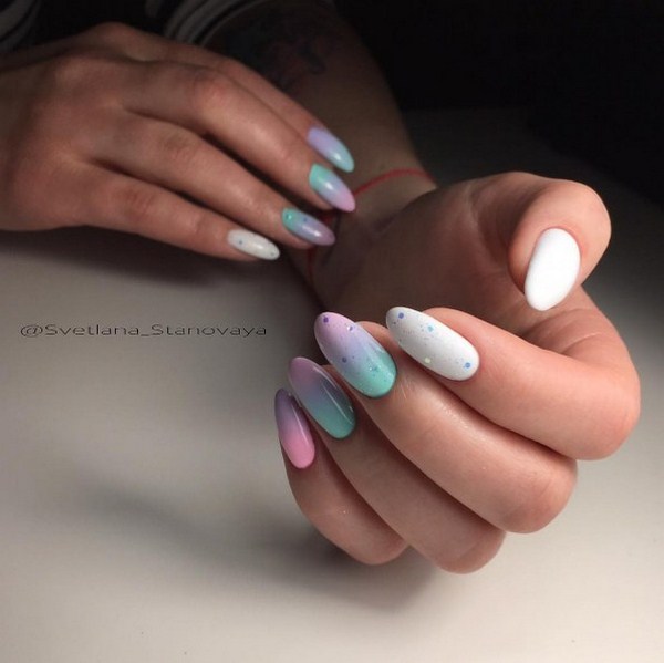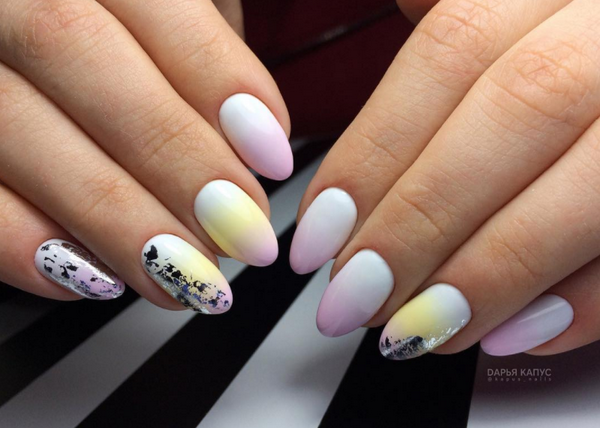 Un design ombré n’est pas une technologie d’ongle moins populaire qui vous permet d’utiliser plusieurs teintes de vernis dans une manucure à la fois. Les interprétations de la manucure dégradée printemps-été, avec des tons clairs et doux, sont nombreuses - sous la forme d'un dégradé linéaire, horizontal, vertical, allant du souci au souci. Dans le même temps, une conception ombrée à la mode vous permet de sélectionner des doigts individuels, en les recouvrant de cristaux, ainsi que d'utiliser d'autres techniques associées à la manucure ombrée pour le printemps et l'été.