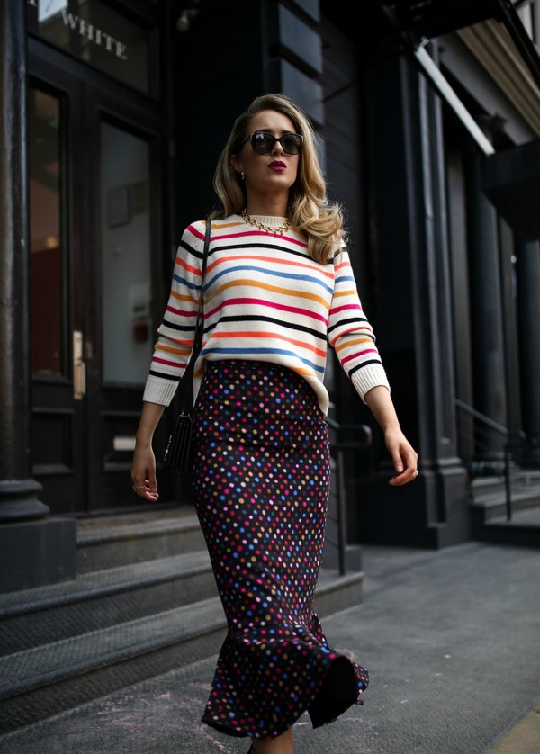 Les pois à la mode auront l’air charmant avec la solution combinée de motifs sur les vêtements - avec des rayures, par exemple. Les pois de différentes tailles ont également l’air génial dans une tenue: un grand, moyen, petit imprimé se complèteront parfaitement, offrant aux fashionistas un nouveau regard sur un «pois familier».