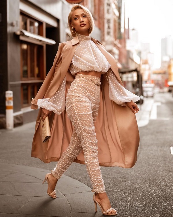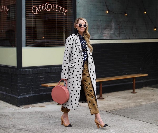 Pour les dames les plus audacieuses, des images ludiques au style de look total avec une impression de pois sont proposées. Cela peut être un costume avec un pantalon et une veste, complété par un manteau ou un trench. Vous pouvez également choisir un «arc total» en pois avec un pantalon, une blouse et un manteau, qui a l'air extravagant et inhabituellement élégant.