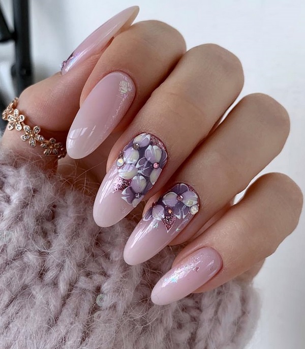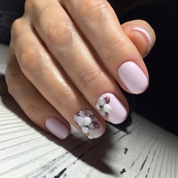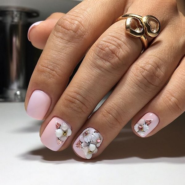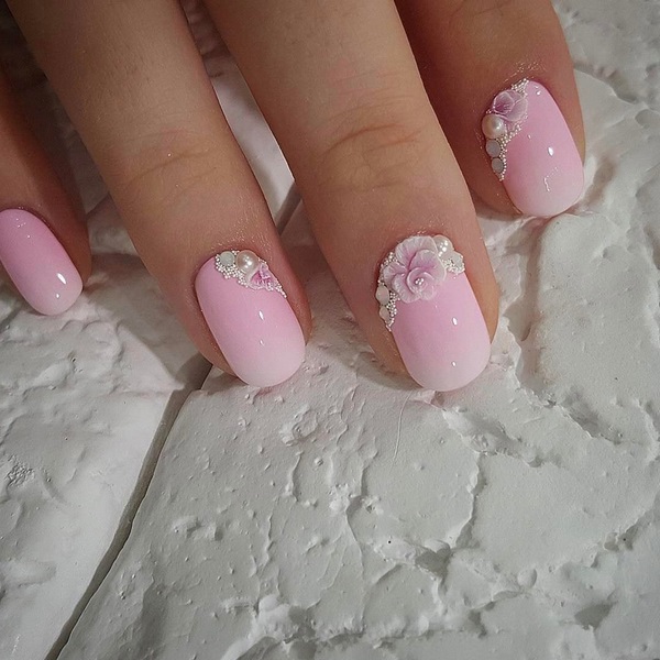 Pour les occasions spéciales et les événements qui diffèrent par une ambiance festive, vous devez choisir une manucure élégante et légère dans laquelle les plus beaux éléments décoratifs. Cela peut être, par exemple, un étonnant dégradé de lumière sur les ongles avec une conception de volume 3D utilisant la technique de modélisation. Les perles et les cristaux sont parfaits pour lui.