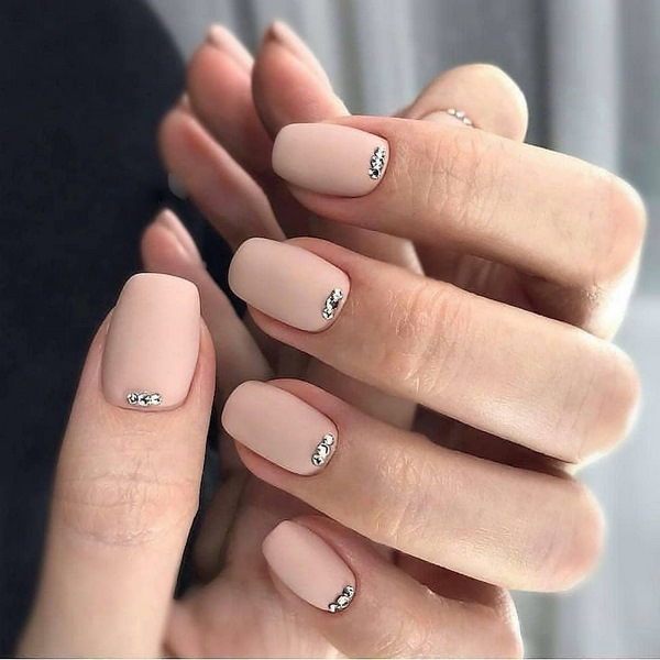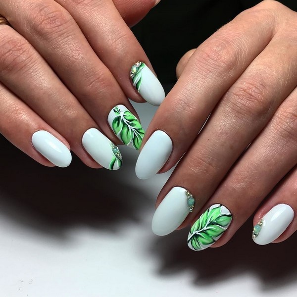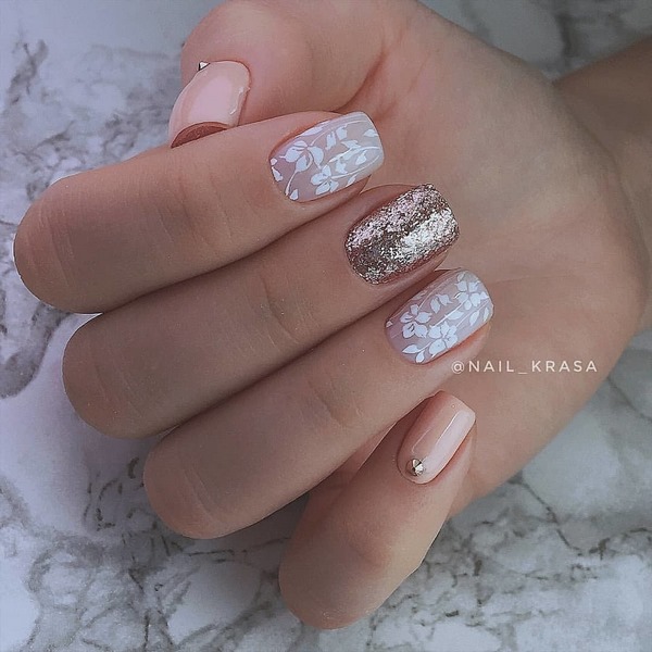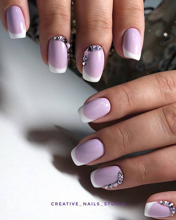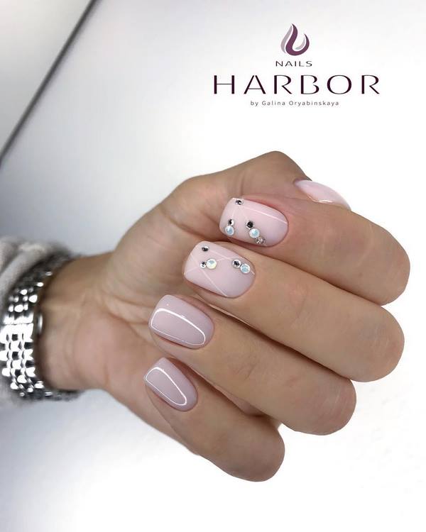 Voulant mettre l'accent sur les manucures légères avec des strass, les maîtres recommandent d'utiliser une dispersion de cristaux de lutin ou de disposer de petits strass sur quelques soucis. De beaux cailloux sont accueillis dans une manucure combinée avec des fleurs, des motifs graphiques et une volumineuse manucure légère.