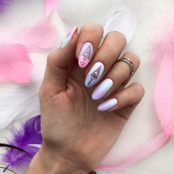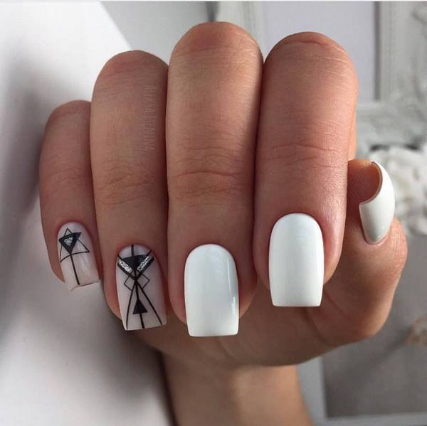 La manucure géométrique aux couleurs vives est belle dans tous les cas - au bureau comme en vacances. Dans le premier cas, il convient de privilégier les clous légers au fini mat, dans le style du minimalisme et de "l'espace négatif". Dans le second cas, une manucure légère à la mode avec des étincelles semblera parfaite.