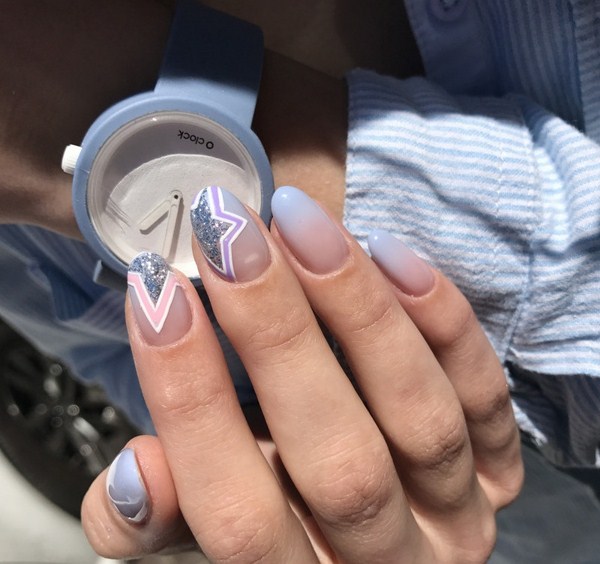 Un design des ongles élégant ou délicat pour l'hiver 2025-2026 aidera à effectuer les transitions de couleur en dégradé dans une manucure d'hiver. Des lignes ombrées étonnantes dans une nuance de gris ou, par exemple, de bleu, ont l'air fraîches et élégantes dans la conception hivernale des ongles courts et longs. Une telle manucure à gradient tendance pour l’hiver convient aux ensembles de tous les jours et de vacances.
