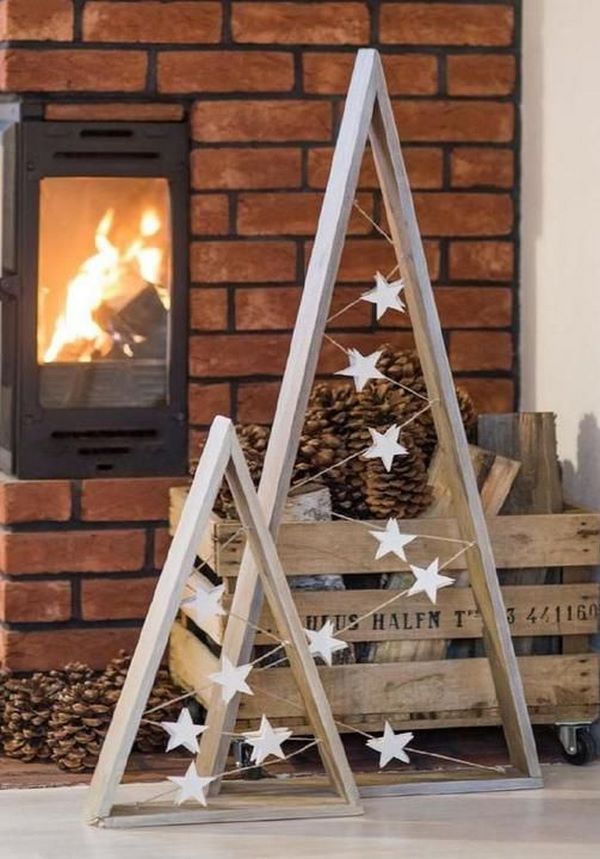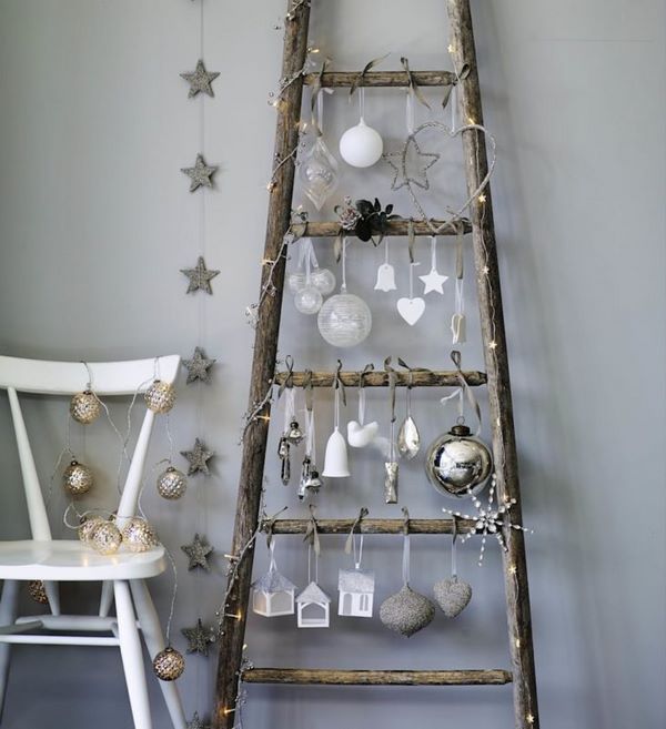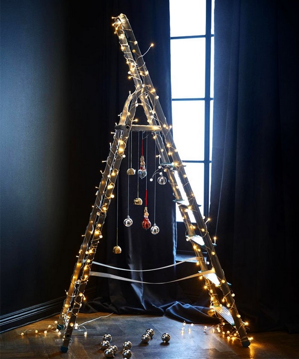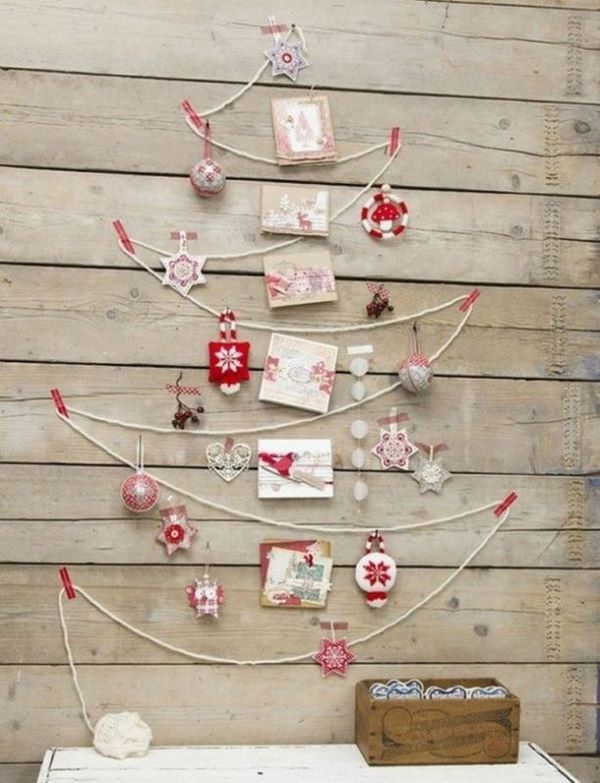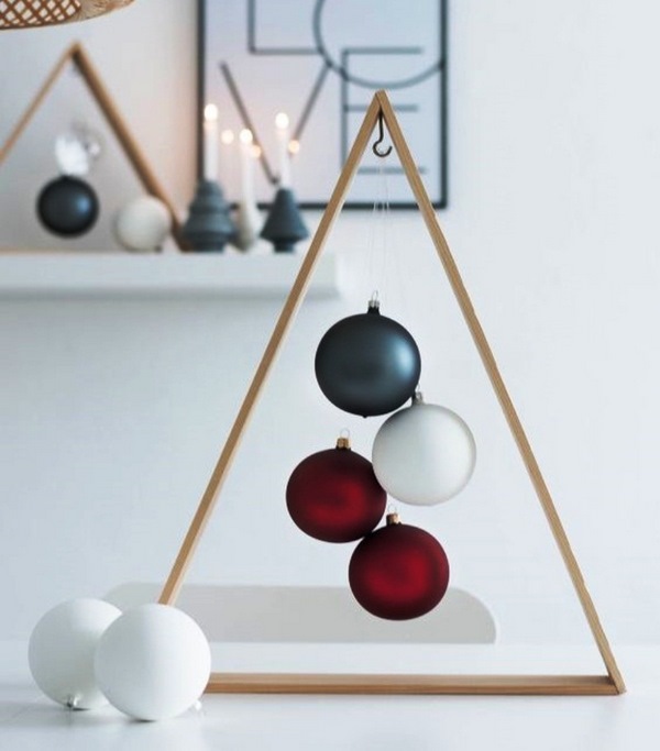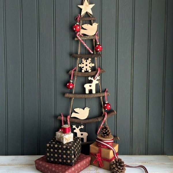 Une version alternative du sapin de Noël a été proposée par les concepteurs sous forme de décoration murale utilisant des branches en bois, une échelle ou une corde, qui ressemble à un sapin de Noël en forme. Le cadre en forme de triangle en bois aura également l’air cool, à l’intérieur duquel vous pourrez suspendre des boules scintillantes et fixer un tel arbre de Noël au mur.