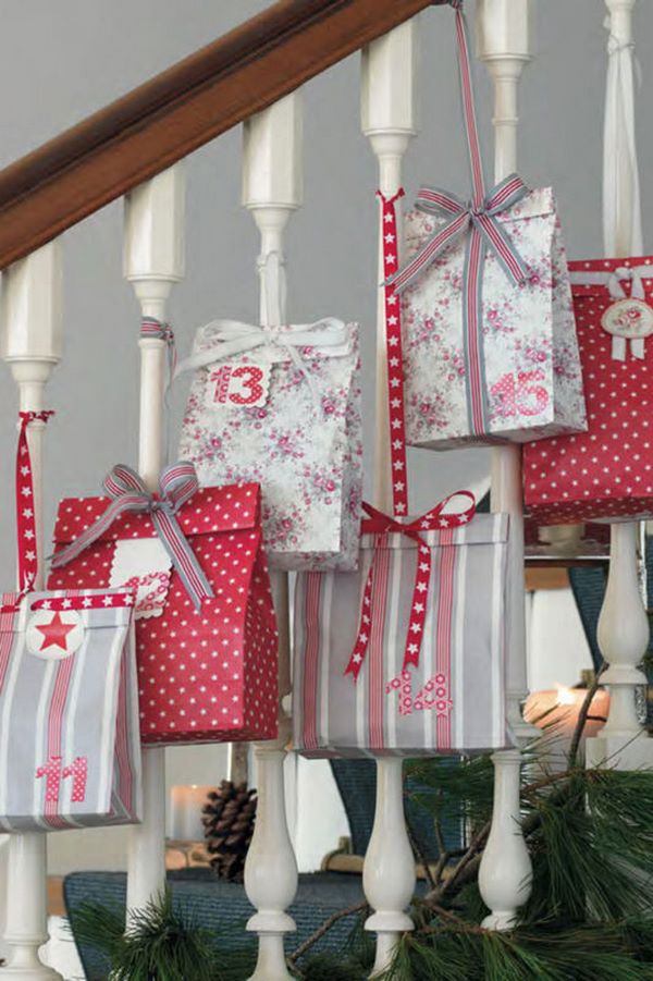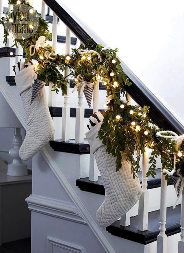 - tendance Décor d'escaliers du nouvel an à l'aide de branches de sapin, de pendentifs pour les escaliers sous forme de décorations en textile doux, de cônes avec rubans et sacs-cadeaux, de chaussettes de Noël et de guirlandes scintillantes;