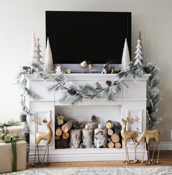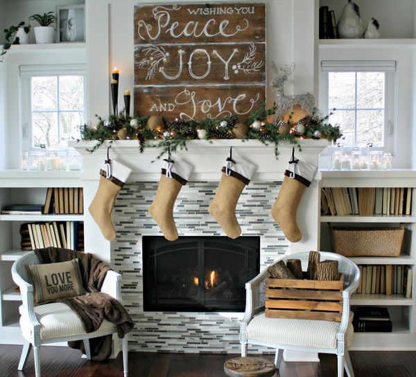 - le plus beau décor de cheminée de noël en utilisant des bougies, des guirlandes, des cônes, des branches de sapin, des boules de Noël, des chaussettes de Noël et des jouets de bricolage.