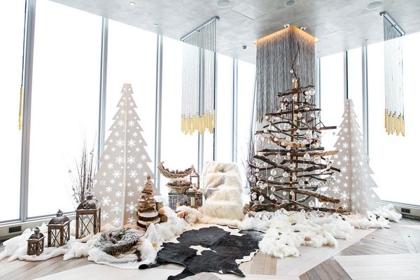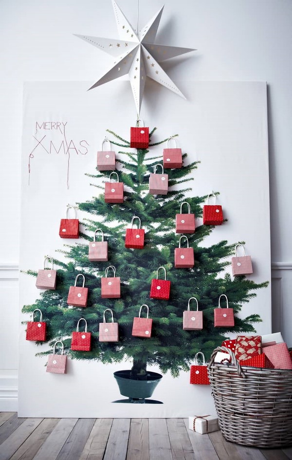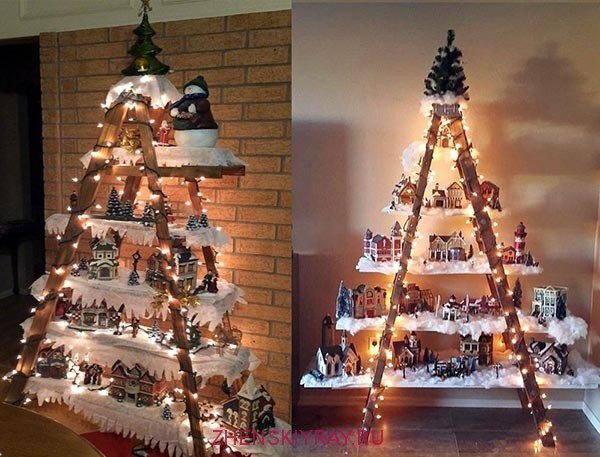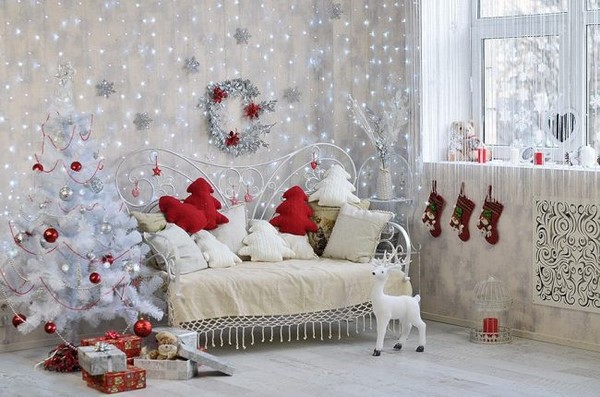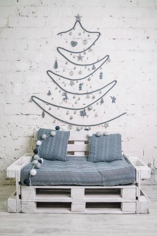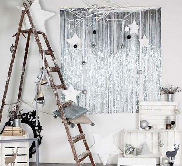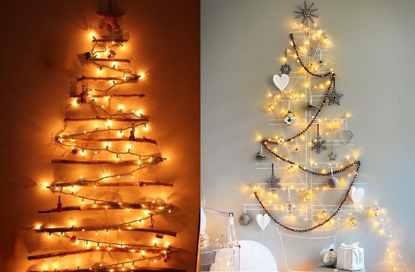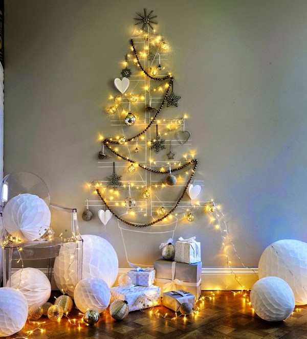 Et bien sûr, le sapin de Noël accroché au mur est l’un des décors muraux les plus recherchés pour le Nouvel An! Au mur, placez à l’écran des arbres de Noël blancs avec des lumières lumineuses, des guirlandes en forme d’arbres de Noël, ainsi que d’autres idées pour la décoration murale du Nouvel An.