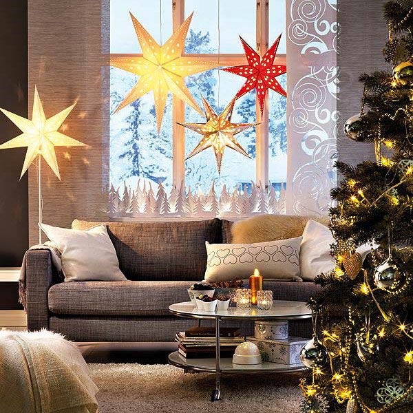Ne pas oublier les décorations de Noël 2026 pour les fenêtres. Il peut s’agir de guirlandes, de jouets suspendus aux fenêtres, de cadeaux, de brindilles, de flocons de neige inhabituels en bois ou de branches d’arbres de Noël.